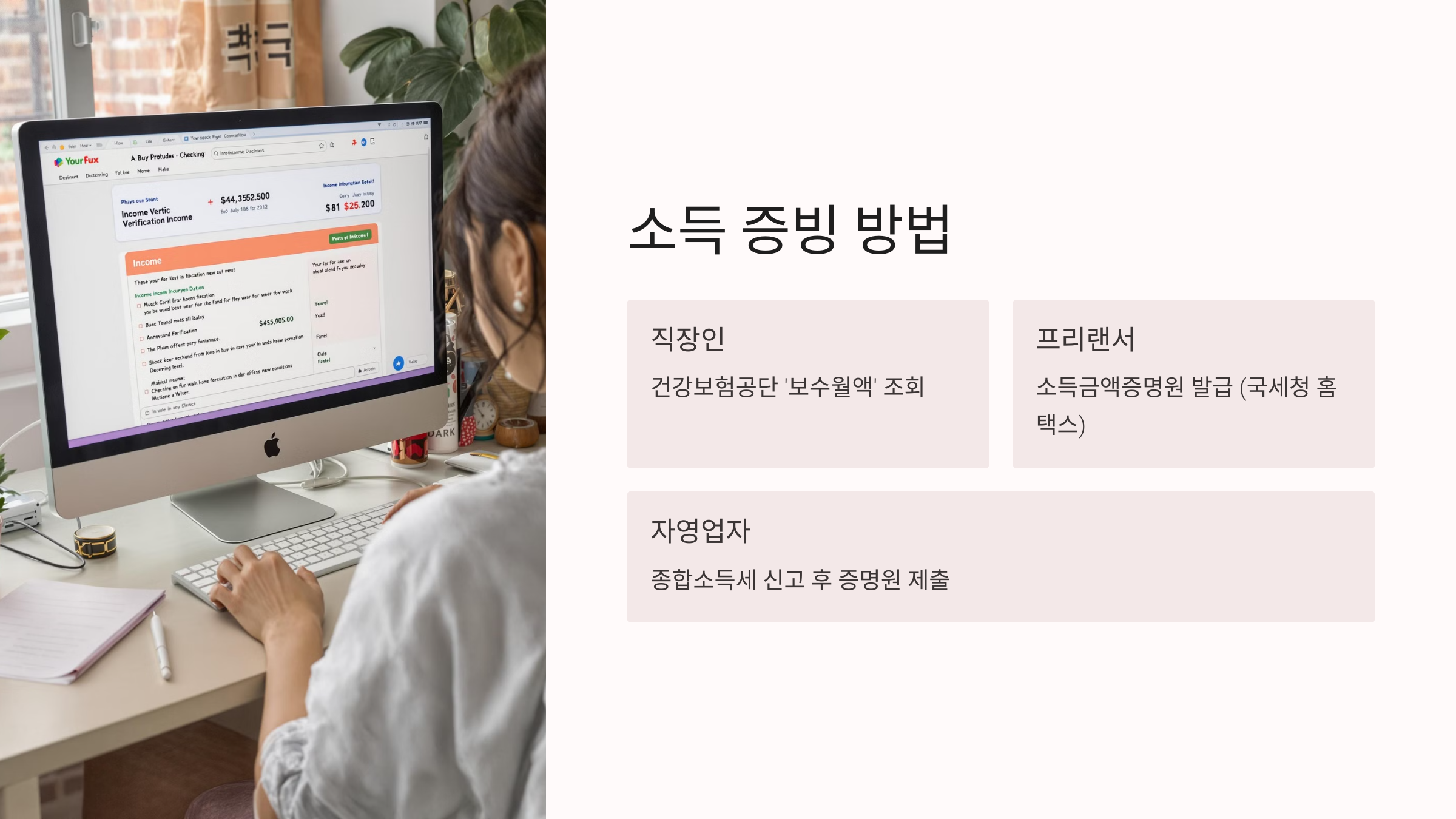 내 소득이 기준에 부합하는지 확인하는 방법도 궁금하셨죠? 직장인과 프리랜서, 자영업자 모두 각자의 방식으로 증빙해야 합니다.