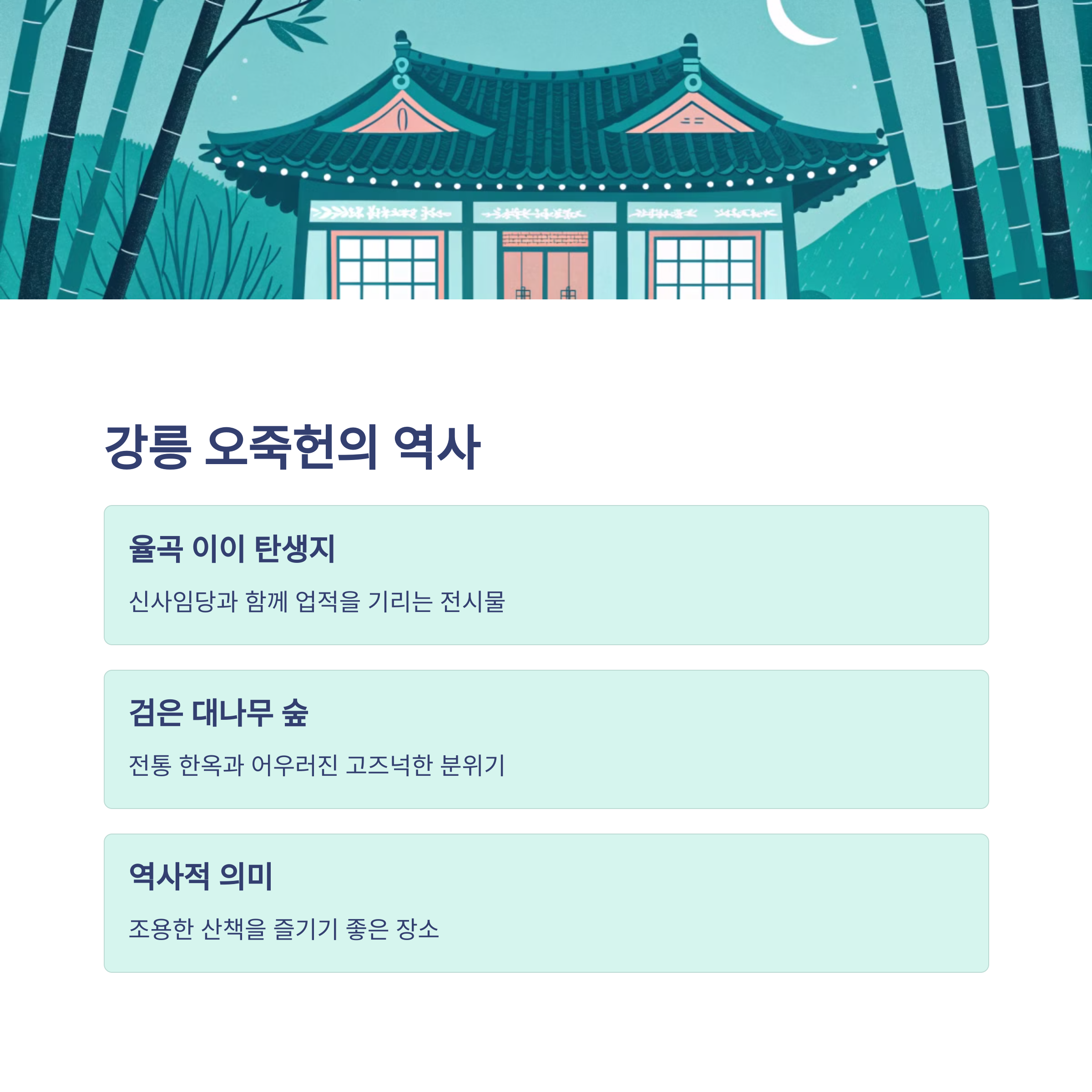 강릉의 오죽헌은 조선시대의 위대한 학자 율곡 이이가 태어난 곳으로, 그의 어머니 신사임당과 함께 그들의 업적을 기리는 전시물이 마련되어 있습니다. 이곳은 검은 대나무 숲과 전통 한옥의 고즈넉한 분위기를 즐기며, 역사적인 의미도 함께 느낄 수 있는 명소입니다. 또한, 오죽헌 주변의 자연은 매우 아름다워서 고요하게 산책하기에 적합한 곳입니다.