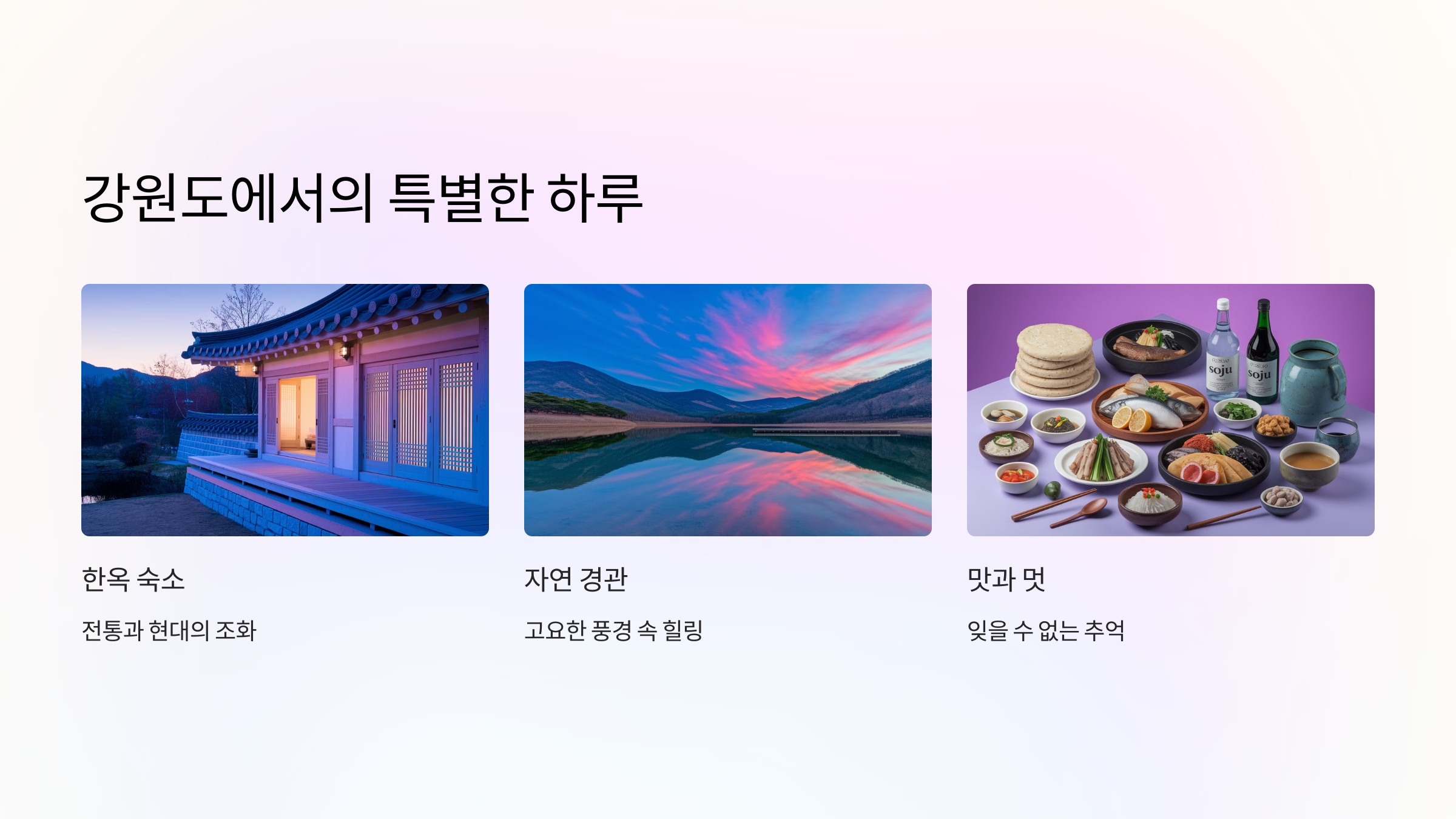 강원도의 한옥 숙소와 주변 명소들은 자연과 전통을 결합한 고요한 풍경 속에서 하루를 보내기에 완벽한 장소입니다.