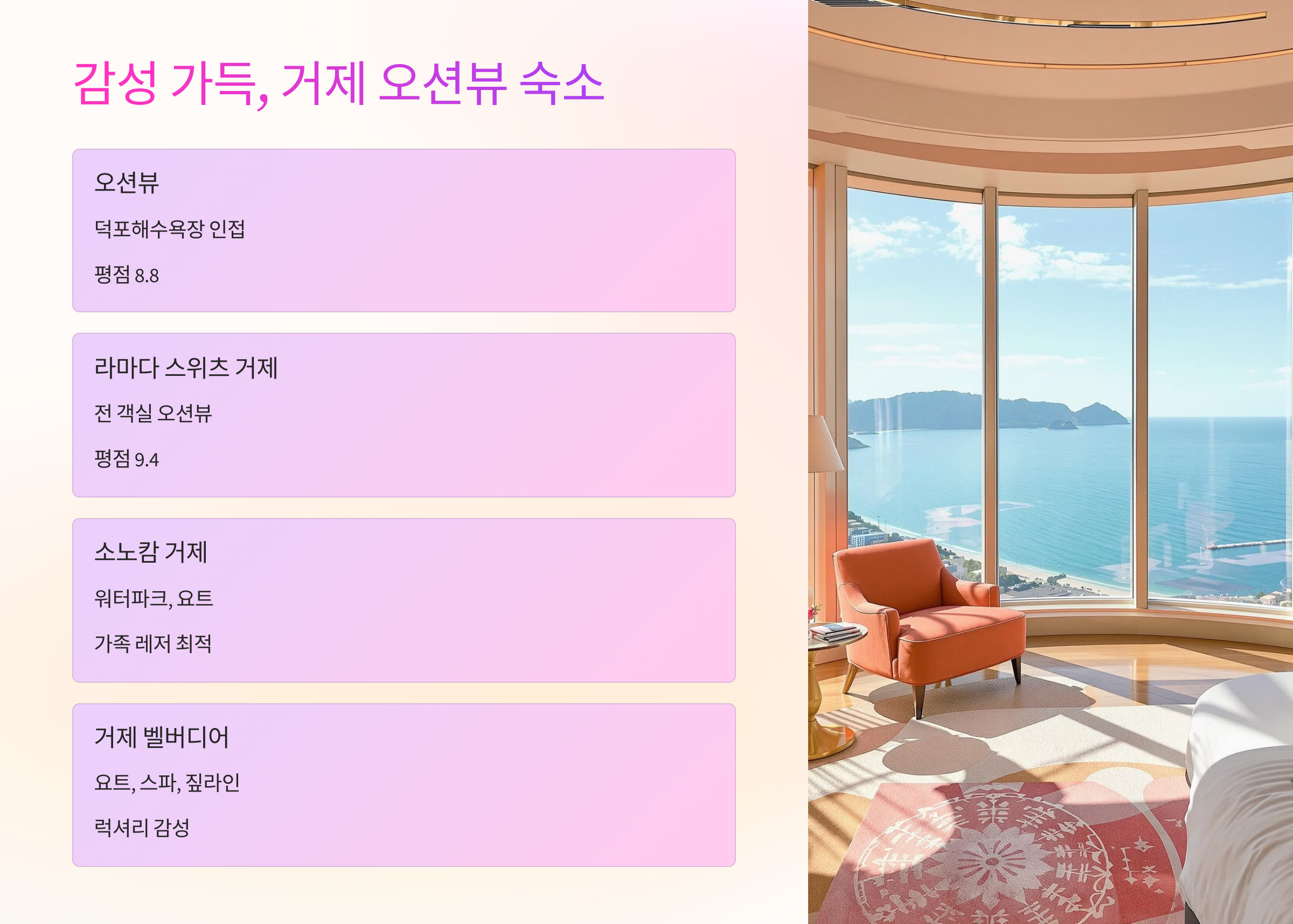 거제도는 숙소 선택이 여행의 절반이라는 말이 실감 날 만큼, 매력적인 오션뷰 숙소가 많습니다. 특히 마음까지 따뜻해지는 감성적인 인테리어와 조용한 바닷가 풍경이 어우러지는 공간들이죠.