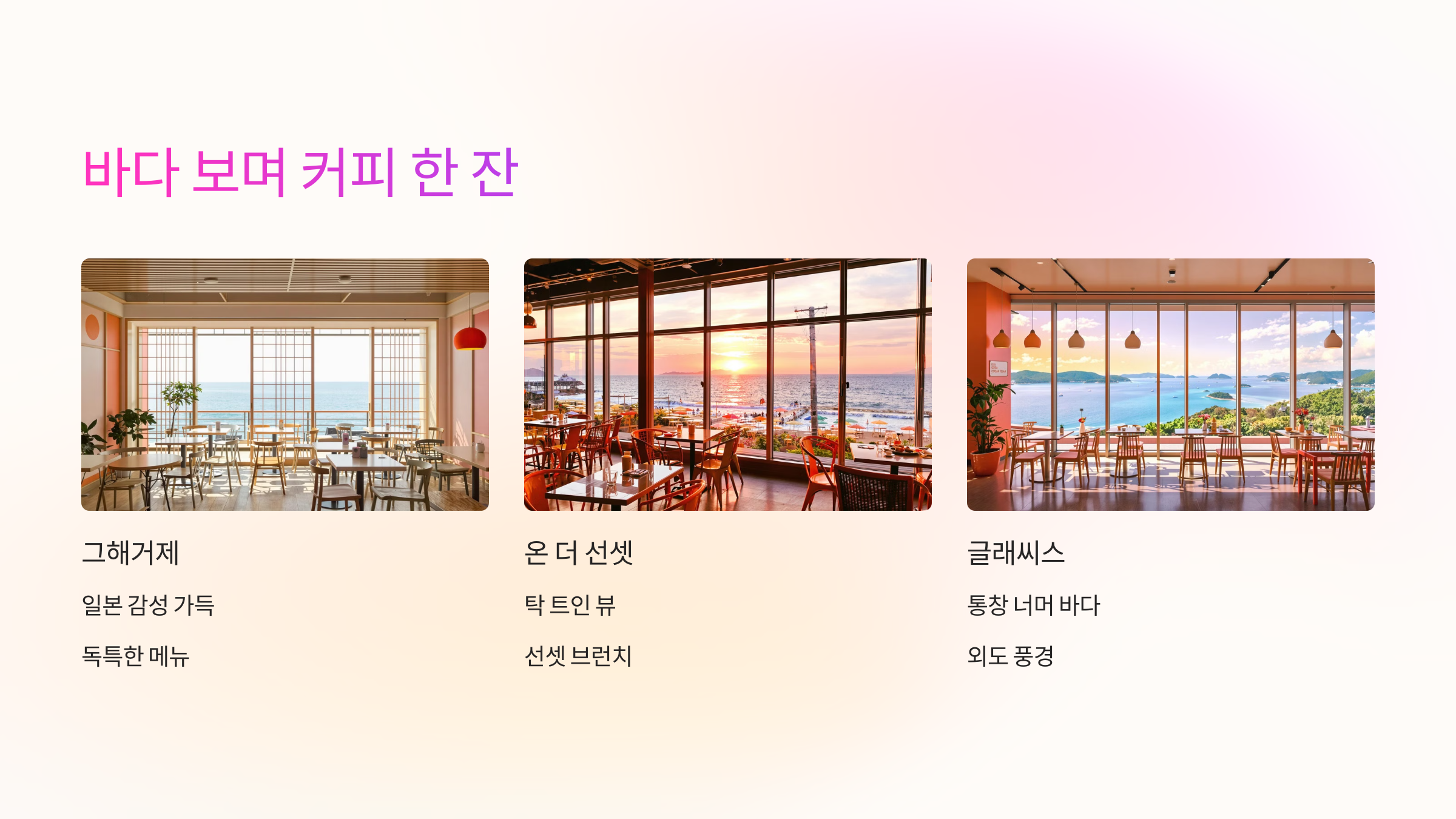 거제의 카페는 단순히 커피 마시는 공간이 아니에요. 마치 영화 속 한 장면처럼, 감정을 자극하는 풍경이 함께하죠. 아래 세 곳은 특히 감성 여행자에게 인기 높은 장소예요.