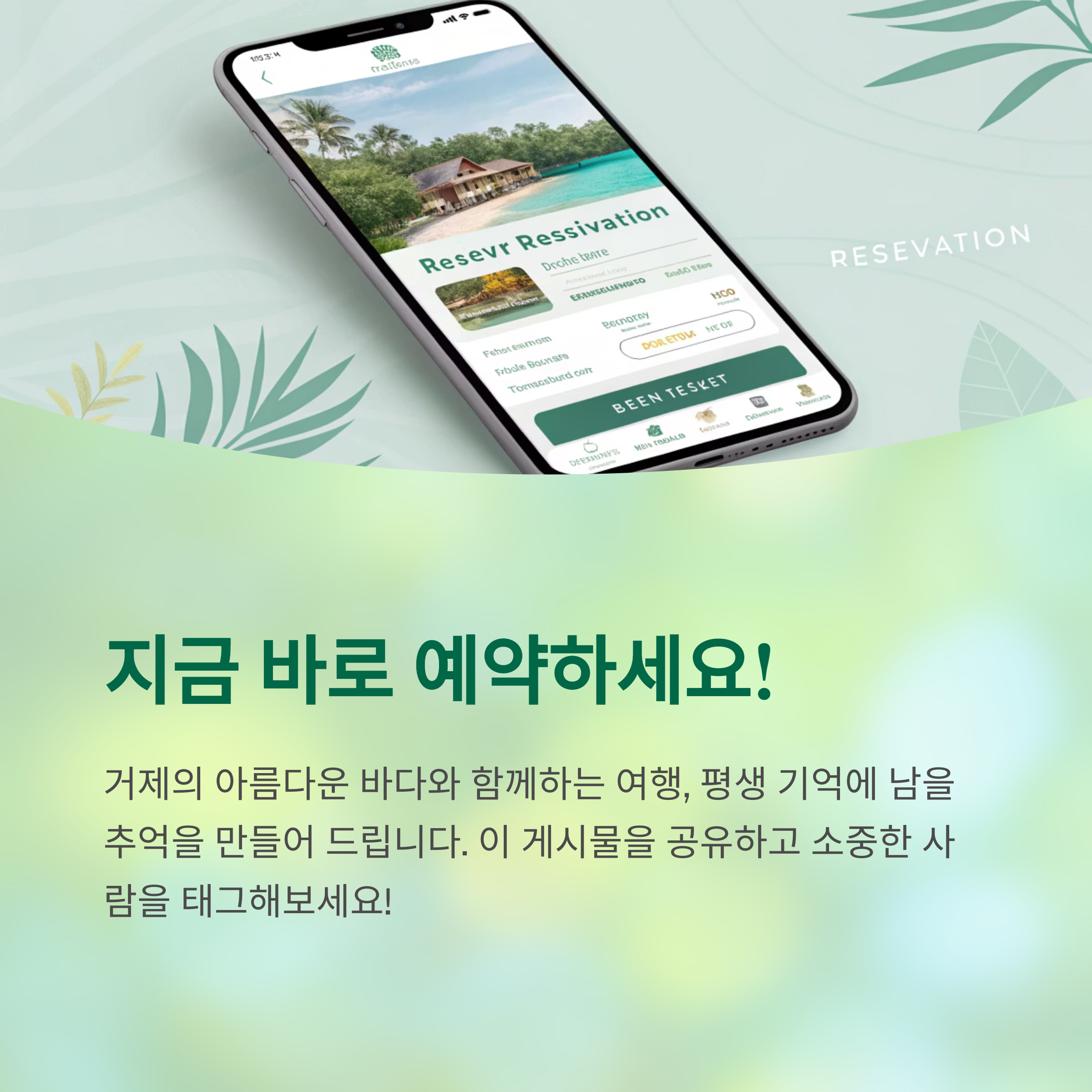 리조트에서의 멋진 여행을 위해 지금 바로 예약하세요. 거제의 아름다운 바다와 함께한 여행은 평생 기억에 남을 거예요!