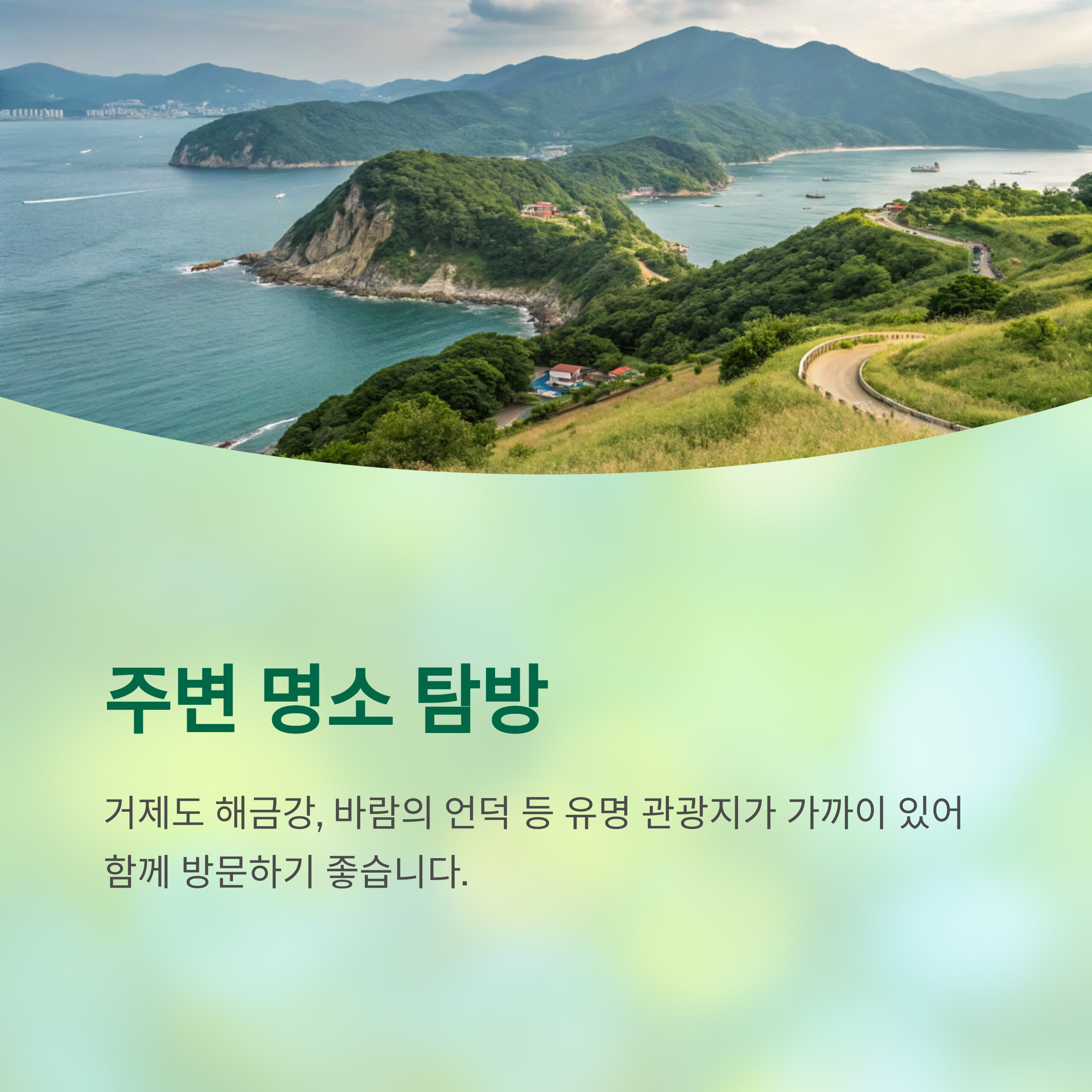 거제는 아름다운 자연경관을 자랑하는 지역으로, 벨버디어 리조트 주변에는 유명한 관광지들이 많습니다. 거제도 해금강, 바람의 언덕 등 인근 명소를 함께 방문할 수 있습니다.