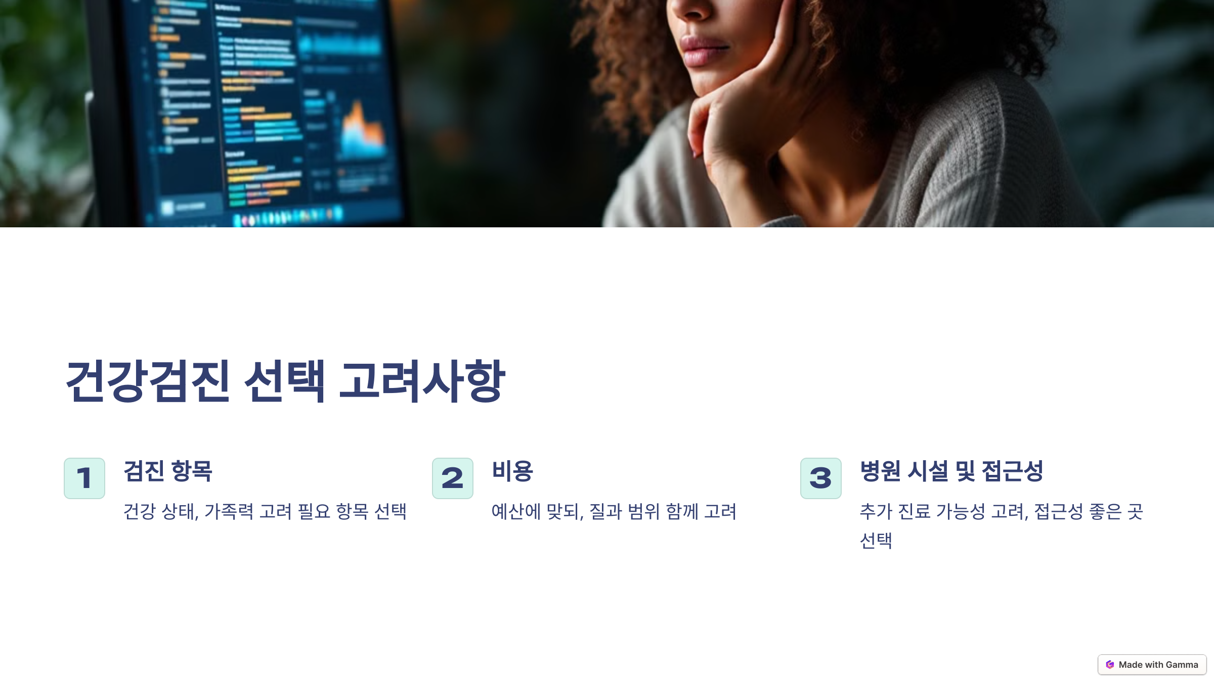 - 비용: 병원마다 비용이 다르므로 예산에 맞는 검진을 선택하시되, 가격만을 기준으로 하기보다는 검진의 질과 범위를 함께 고려하세요.