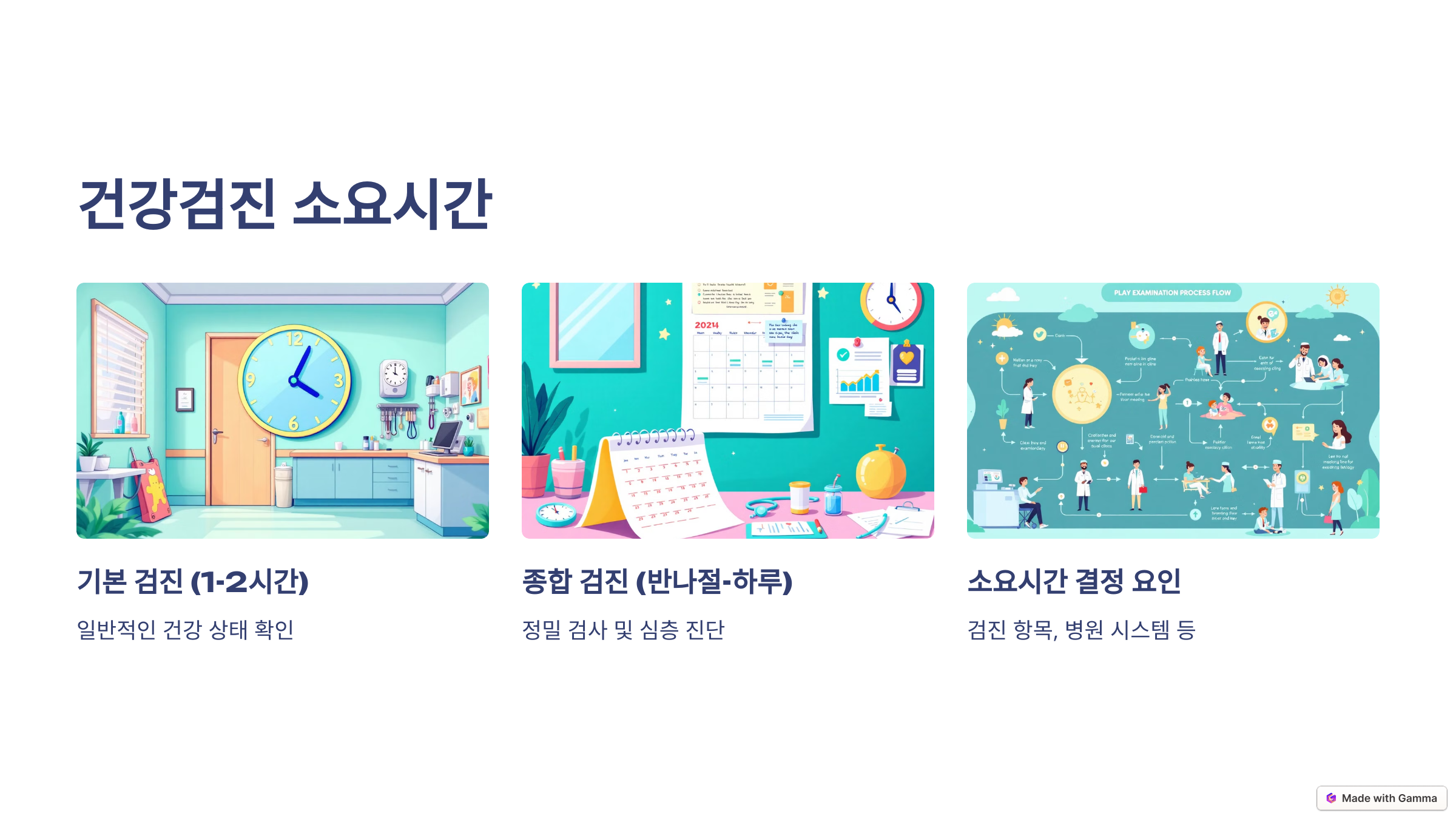 보통 일반적인 기본 건강검진은 1~2시간, 종합검진은 반나절에서 하루 정도 소요될 수 있어요.