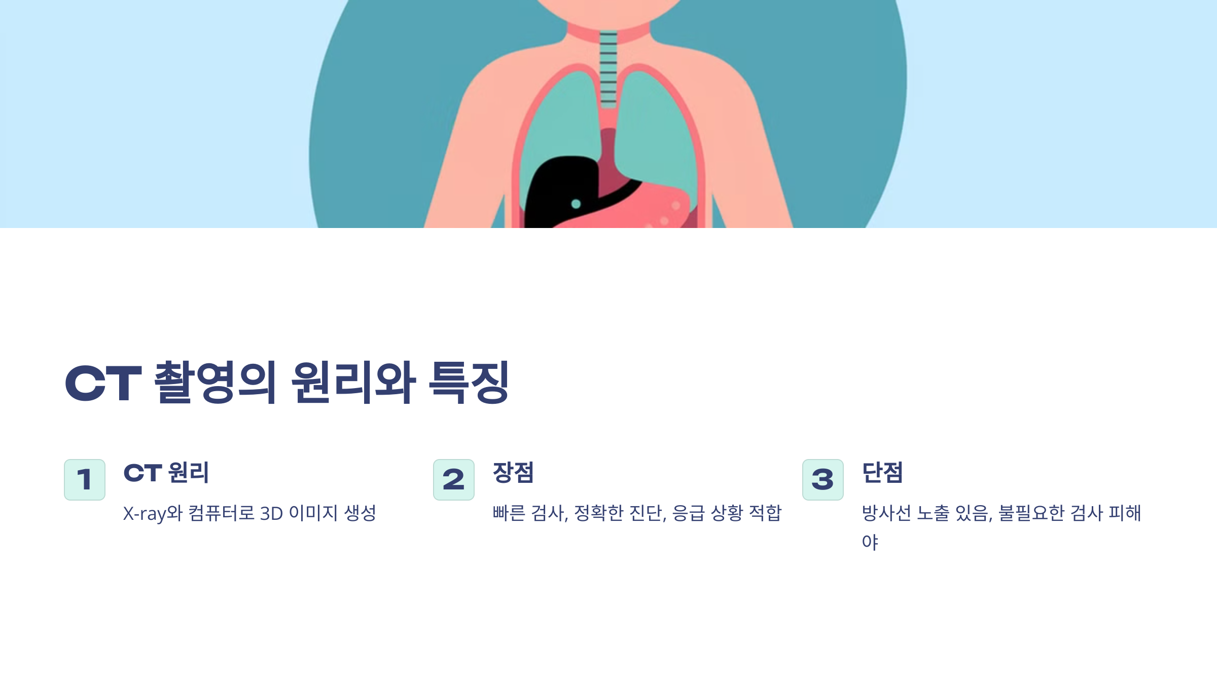 ✅ 어린이, 임산부, 방사선 노출이 많은 직업군(조종사, 원전 근로자 등)은 필요할 때만 CT 촬영이 권장됩니다.