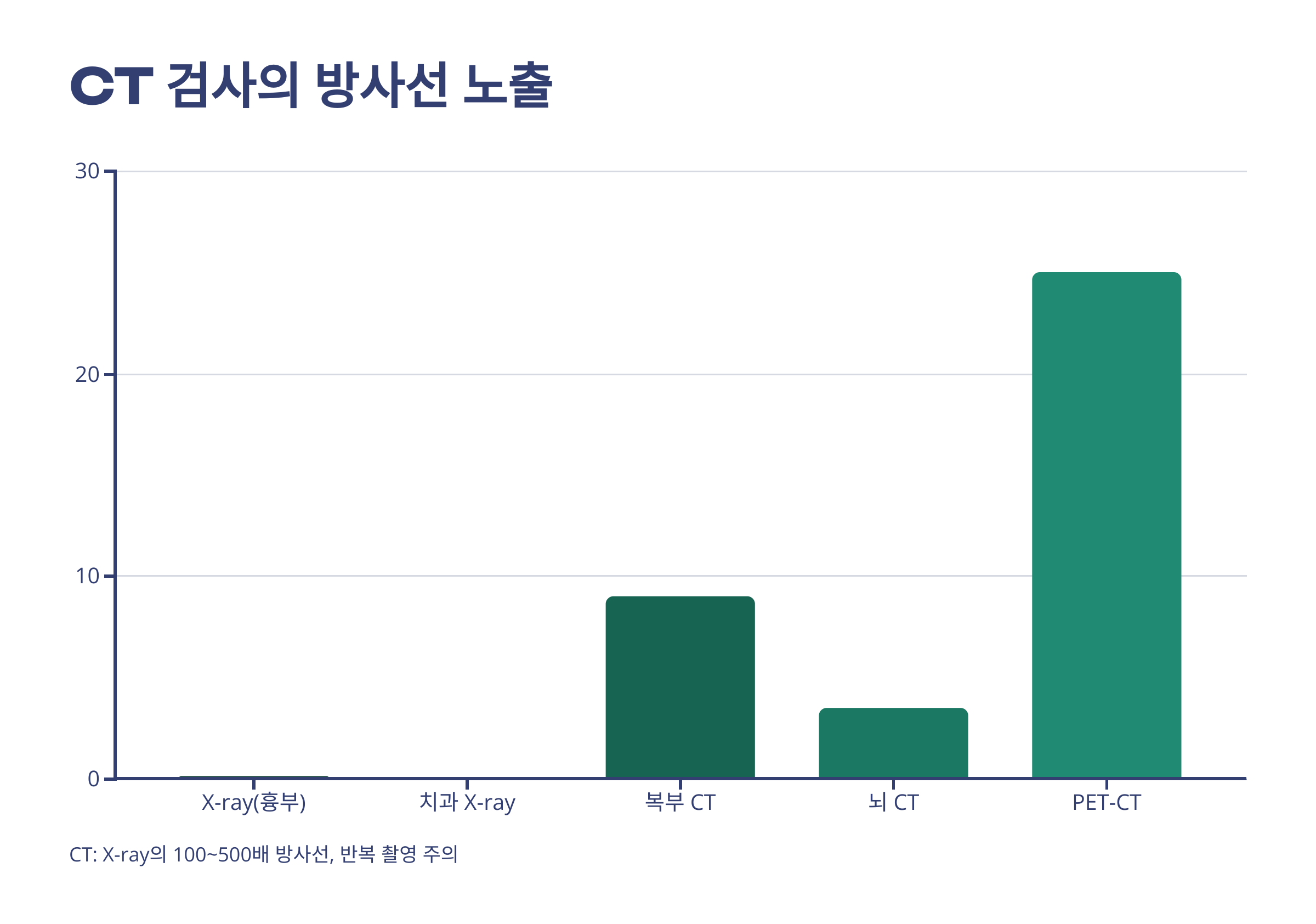 | 복부 CT | 8~10 mSv | 연간 자연 방사선량의 4배 이상 |