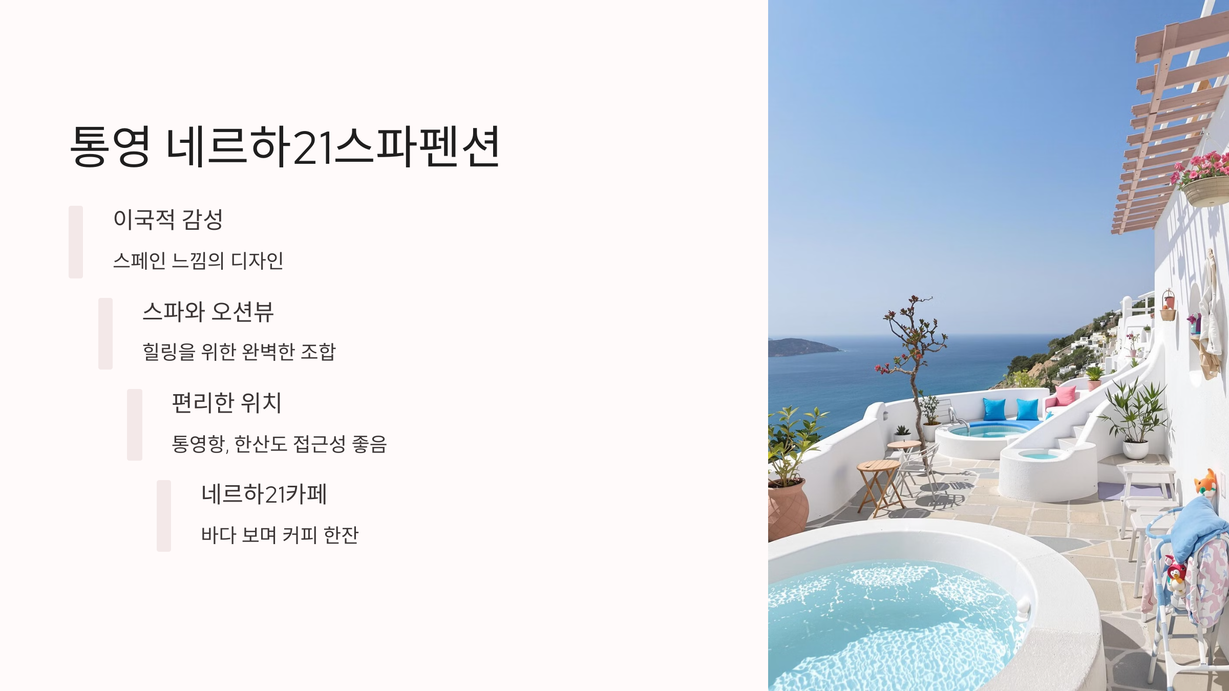 경남 통영시에 위치한 ‘네르하 21 스파펜션’은 이름만 들어도 이국적인 감성이 느껴지죠? 이곳은 스파와 오션뷰가 모두 가능한 감성 숙소로, 조용한 분위기에서 힐링하고 싶은 분들에게 정말 잘 맞아요. 정확한 가격 정보는 없지만, 숙소의 퀄리티와 위치를 고려했을 때 중 상급 이상의 가성비를 보여줍니다.