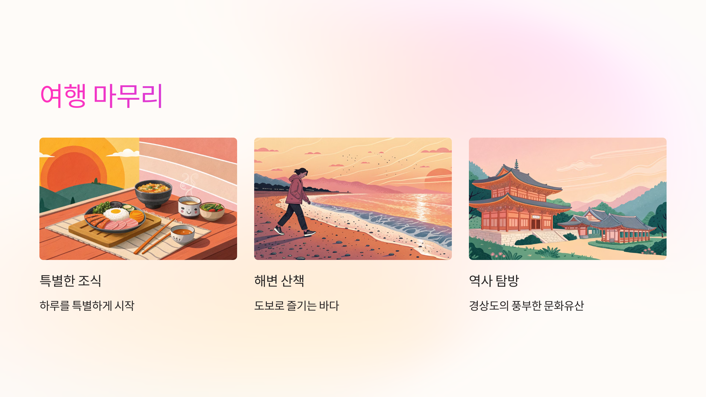 이렇게 정리해 보니, 경상도엔 정말 매력적인 숙소들이 많죠? 단순히 하룻밤 머무는 공간이 아니라, 하루를 특별하게 시작할 수 있는 조식, 그리고 도보로 갈 수 있는 해변까지! 저도 다시 여행 가고 싶은 마음이 샘솟네요.
