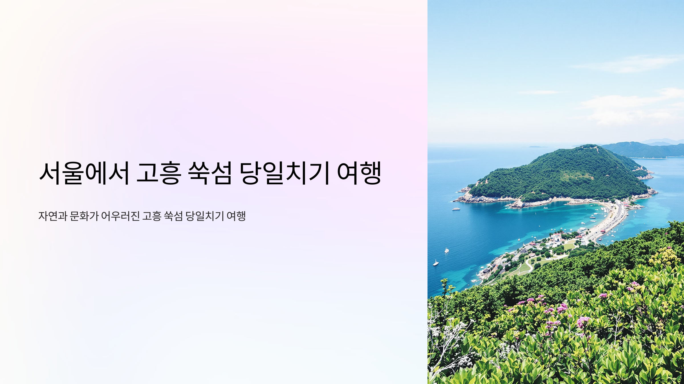 서울에서 출발해 하루 만에 자연과 문화가 어우러진 고흥 쑥섬을 만끽할 수 있는 완벽한 여행 코스를 소개합니다.