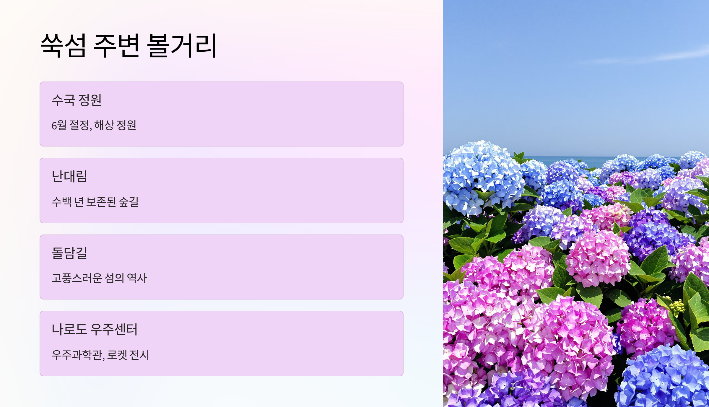 여러분, 고흥 쑥섬은 진짜 힐링이 필요한 분들께 꼭 추천하고 싶은 여행지예요. 바다, 숲, 꽃 그리고 우주까지 한 곳에서 다 느낄 수 있다니, 참 대단하죠. 당일치기든 1박 2일이든, 꼭 한 번 다녀오셨으면 해요.