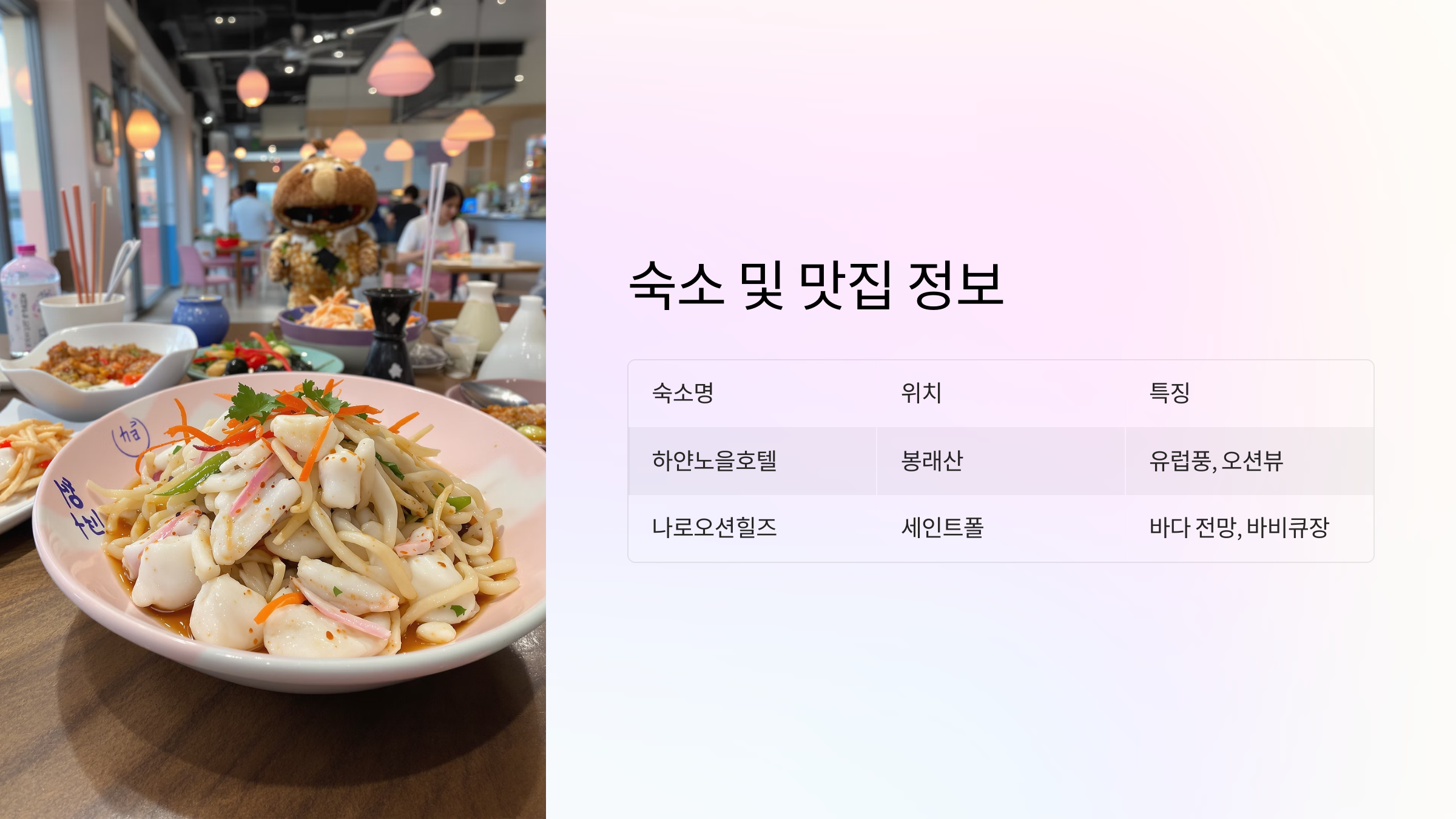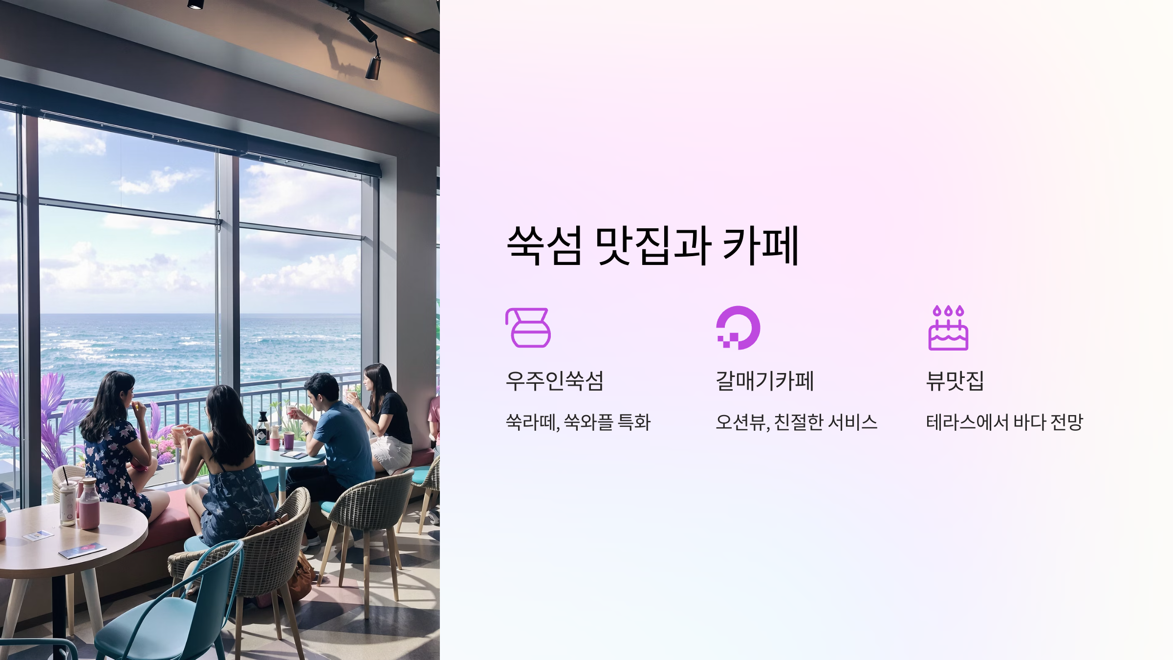 쑥섬에서는 로컬 특산물과 자연을 맛볼 수 있는 곳들이 많습니다. 아래는 제가 추천하는 맛집 리스트입니다.