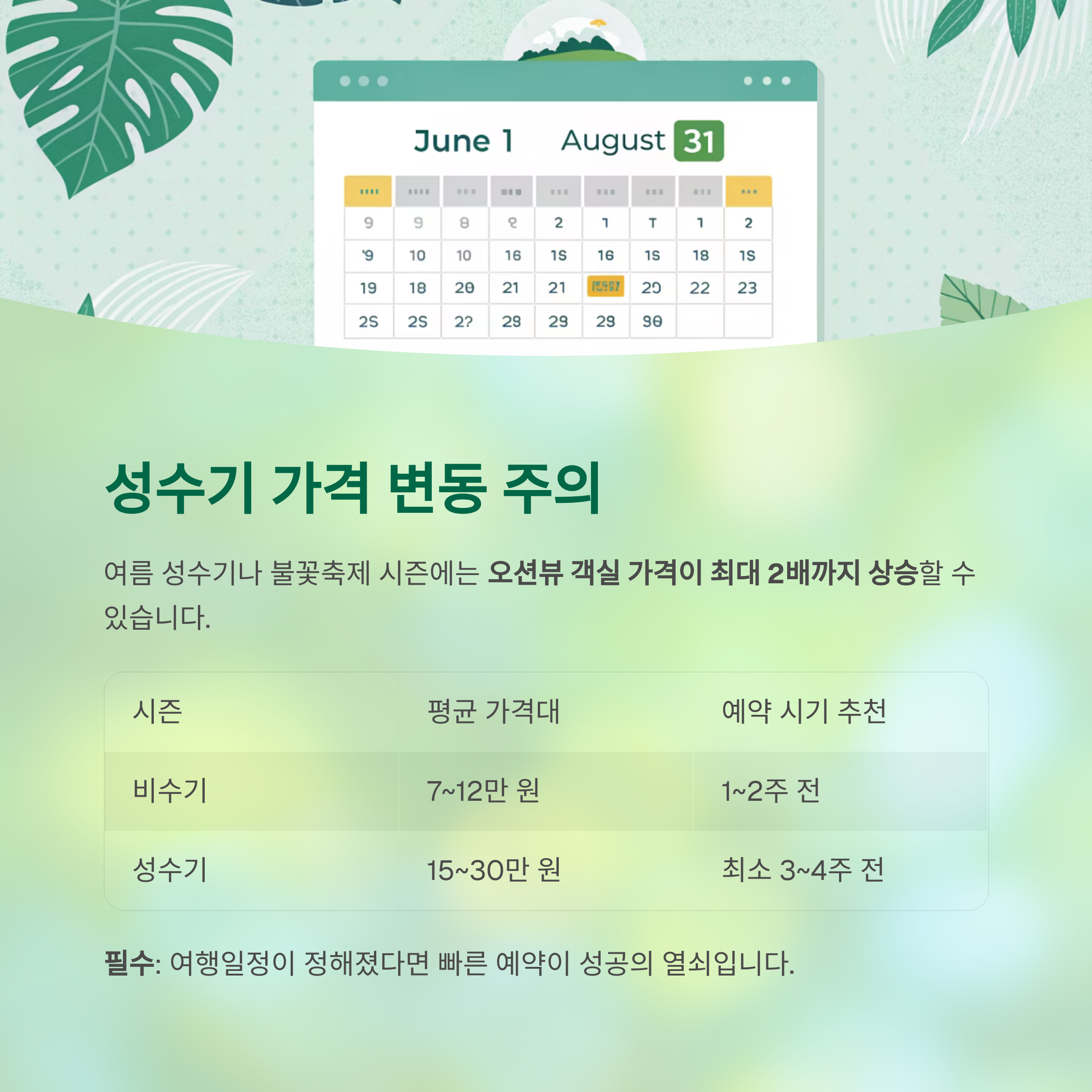 | 성수기 | 15~30만 원 | 최소 3~4주 전 |