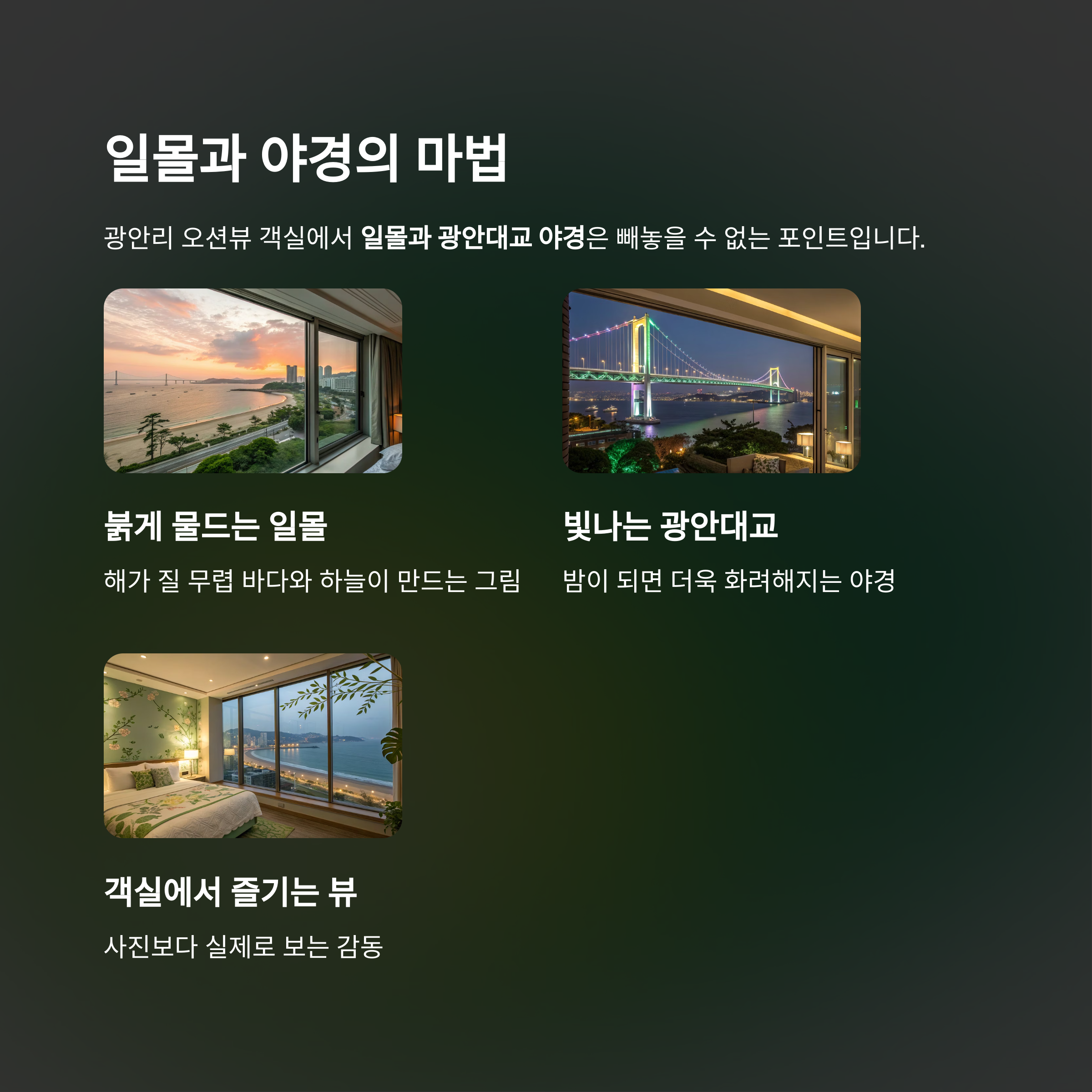 광안리 오션뷰 객실에서 일몰과 광안대교 야경은 빼놓을 수 없는 포인트입니다.