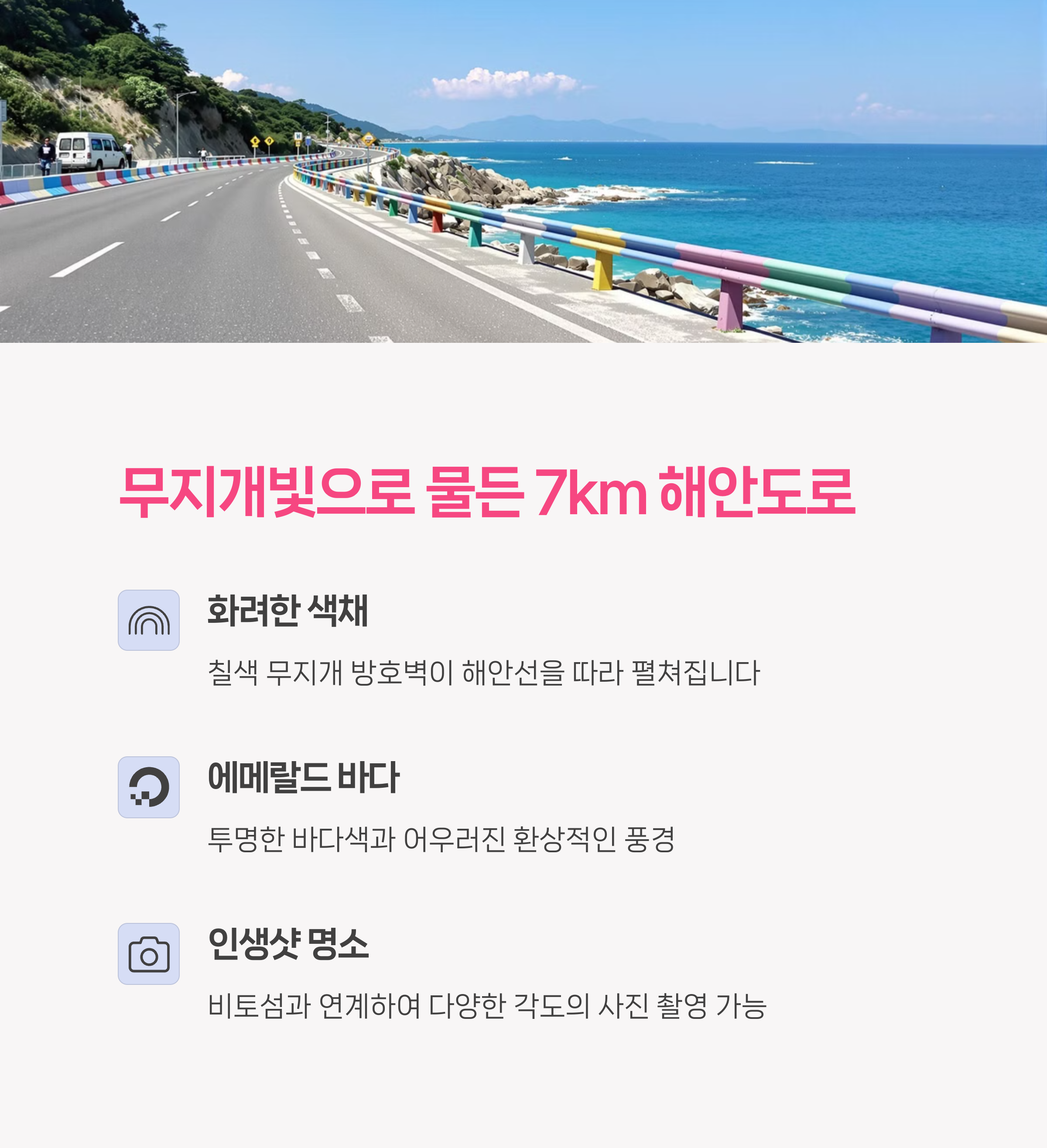 | 무지개빛 방호벽, 갯벌 탐방로, 사진 명소 | 에메랄드빛 바다, 해안도로, 해변 풍경 | 역사적 가치, 일몰 감상, 조용한 풍경 |