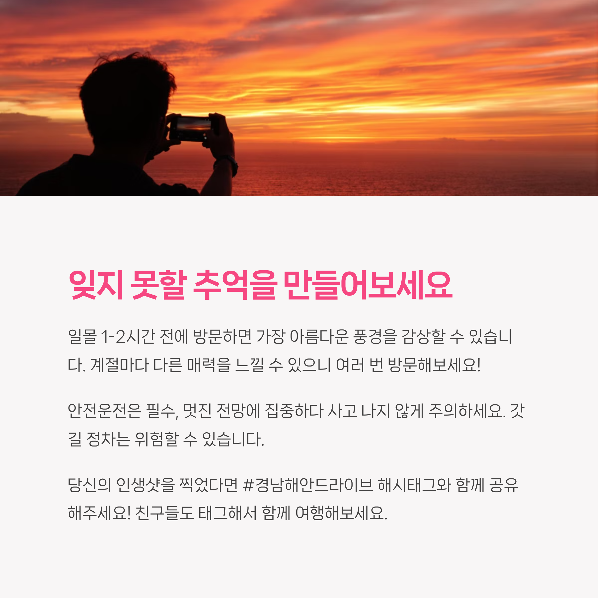 이번에 소개해드린 사천 무지개해안도로, 남해 물미해안도로, 그리고 남해대교 드라이브 코스는 단순한 이동을 넘어 감성과 자연을 동시에 느낄 수 있는 특별한 여행 경험을 제공합니다.