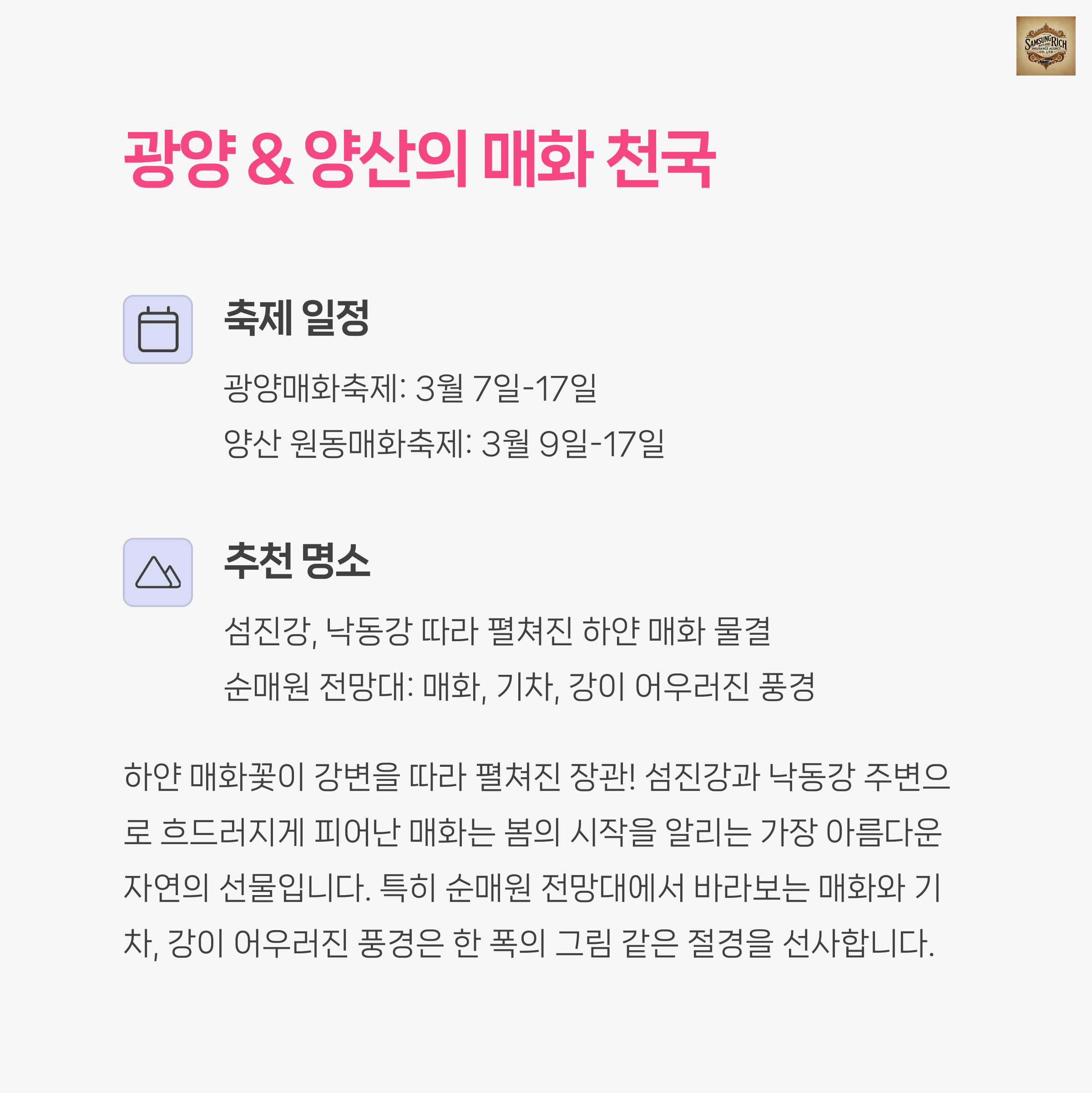 | 매화 명소 추천 | 광양, 양산 등 섬진강·낙동강 따라 펼쳐지는 풍경 |