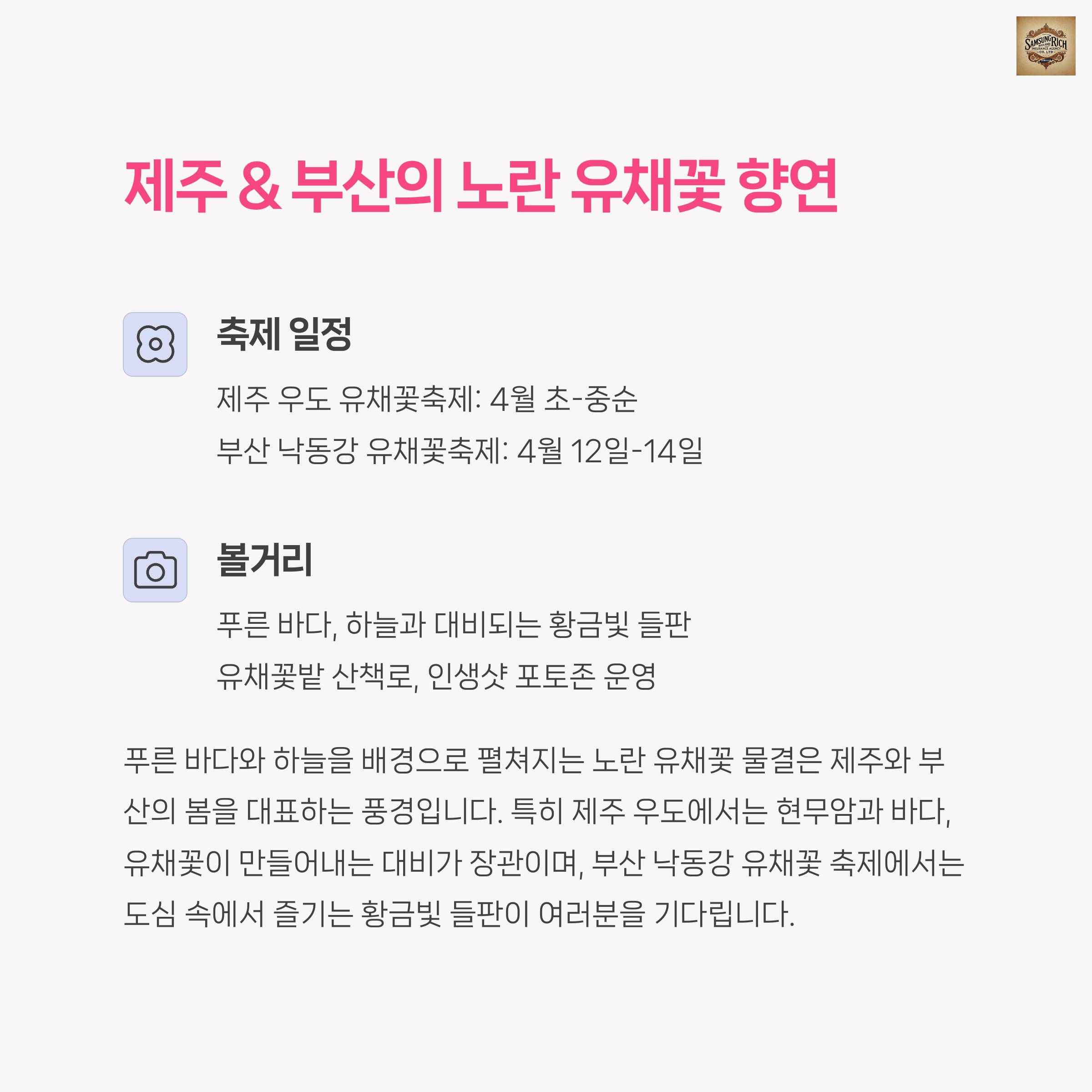 | 유채꽃 명소 추천 | 제주·부산 등 바다와 꽃이 어우러진 장관 |