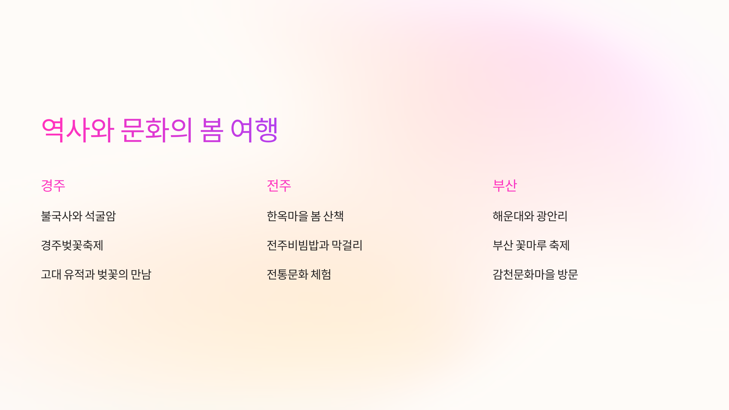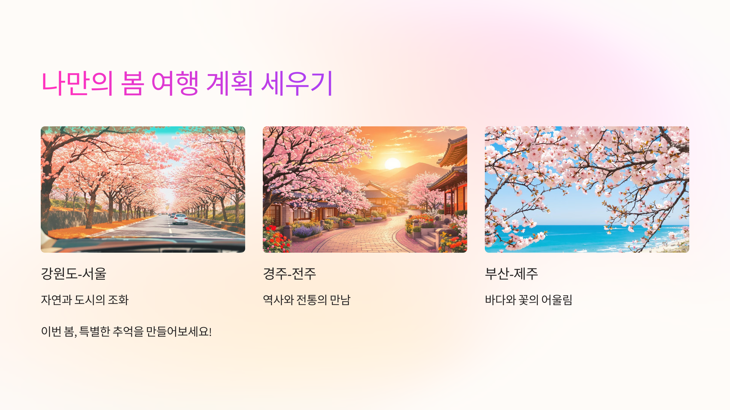 강원도부터 제주까지, 다채로운 여행 코스를 준비했으니, 이번 봄엔 꼭 떠나보세요!