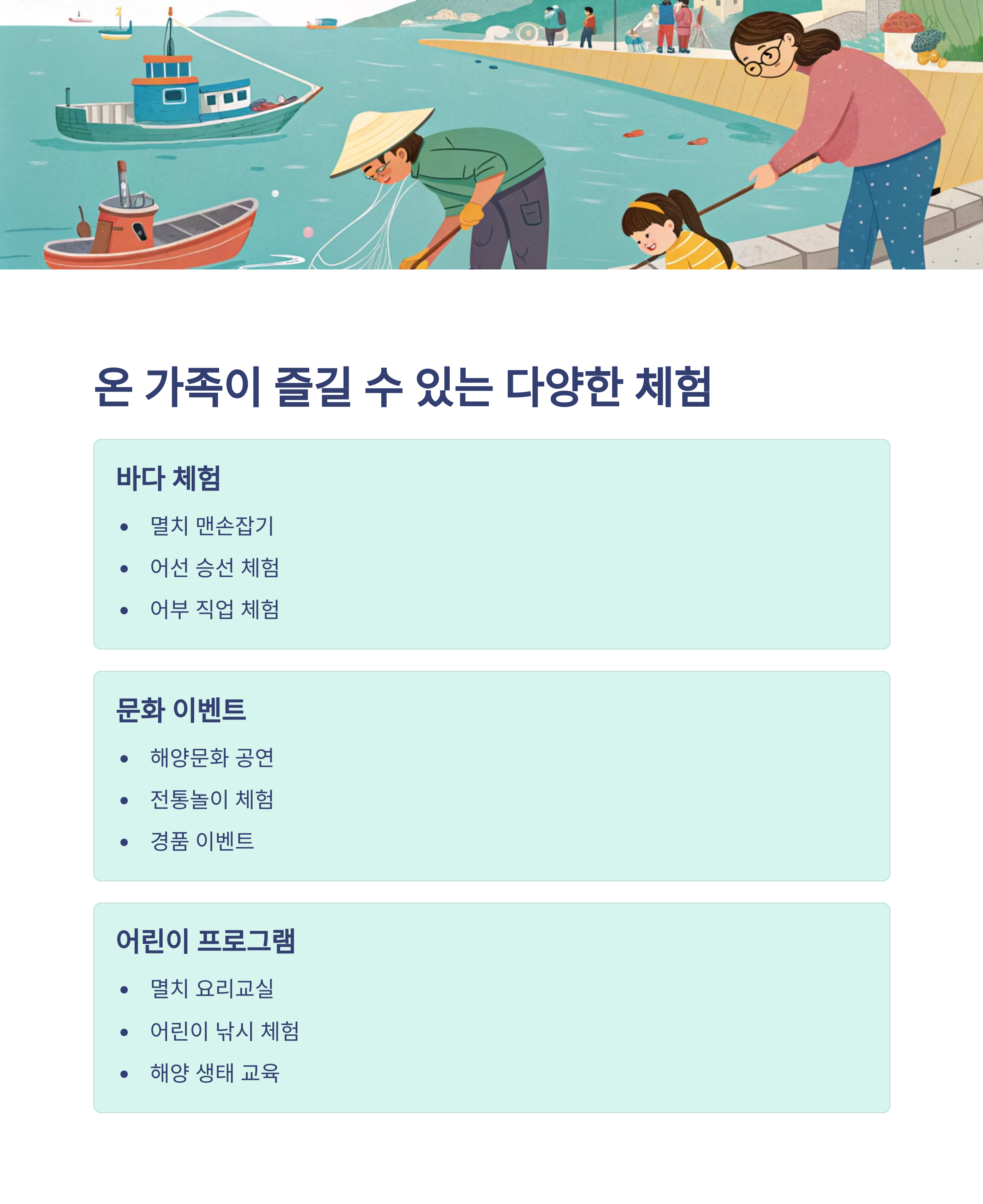 축제 기간 동안 멸치 무료 시식회, 해상 불꽃쇼, 인기 가수 공연 등 다채로운 이벤트가 펼쳐집니다.