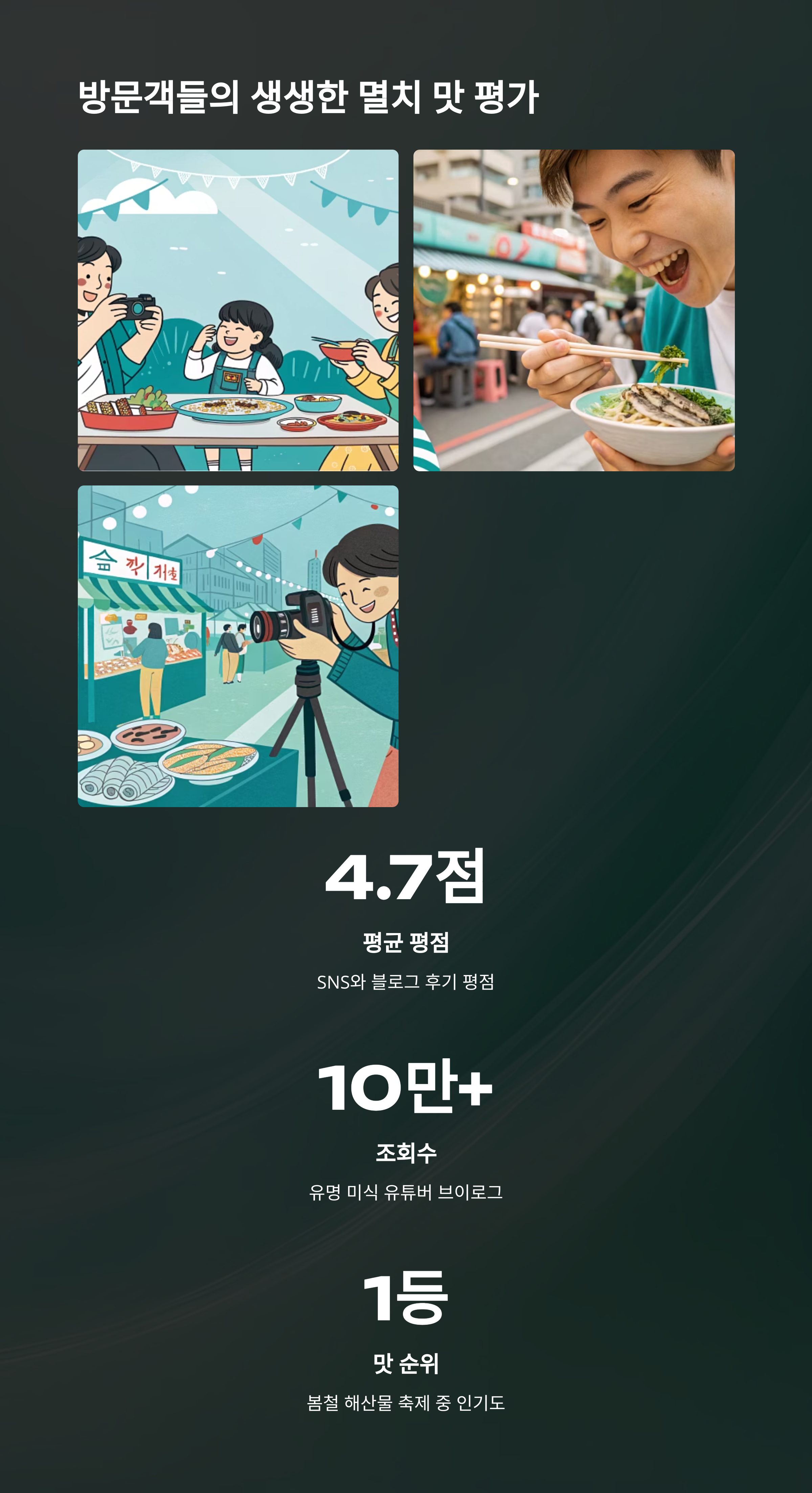 "입안에서 살살 녹는 대멸치회, 웃음이 절로 나와요!"라는 방문객의 말처럼 멸치회는 단순한 요리를 넘어 감동을 줍니다. 🐟