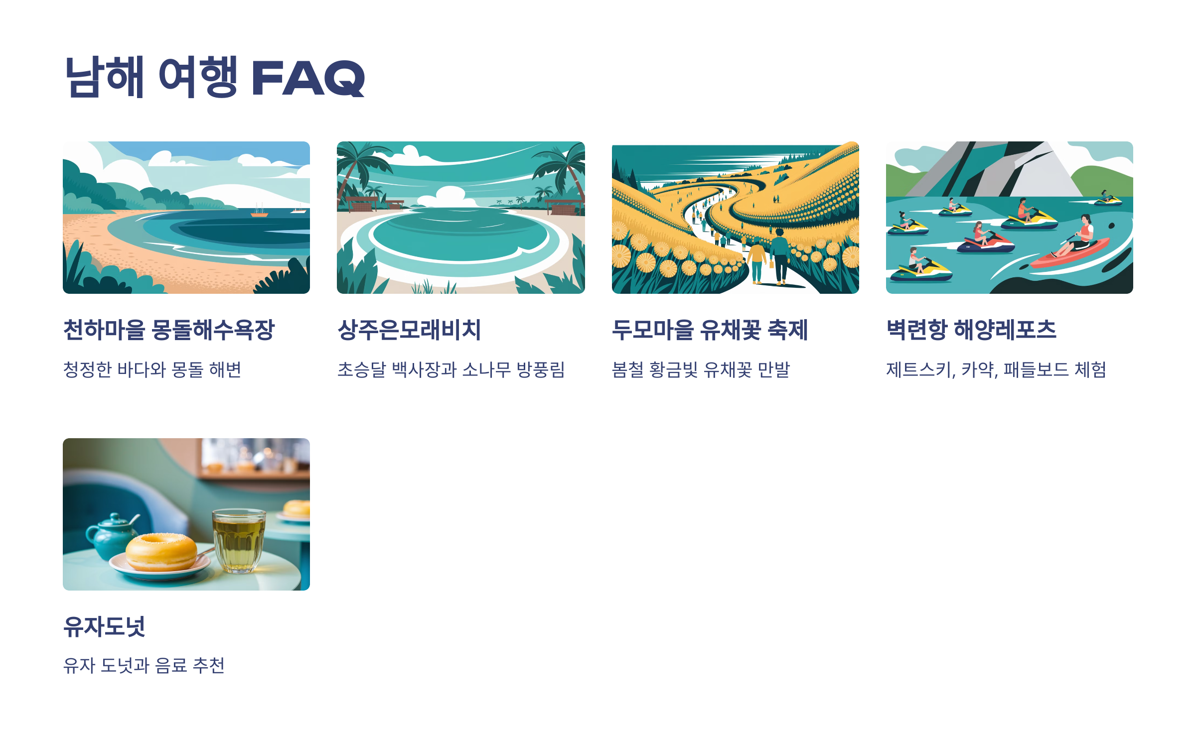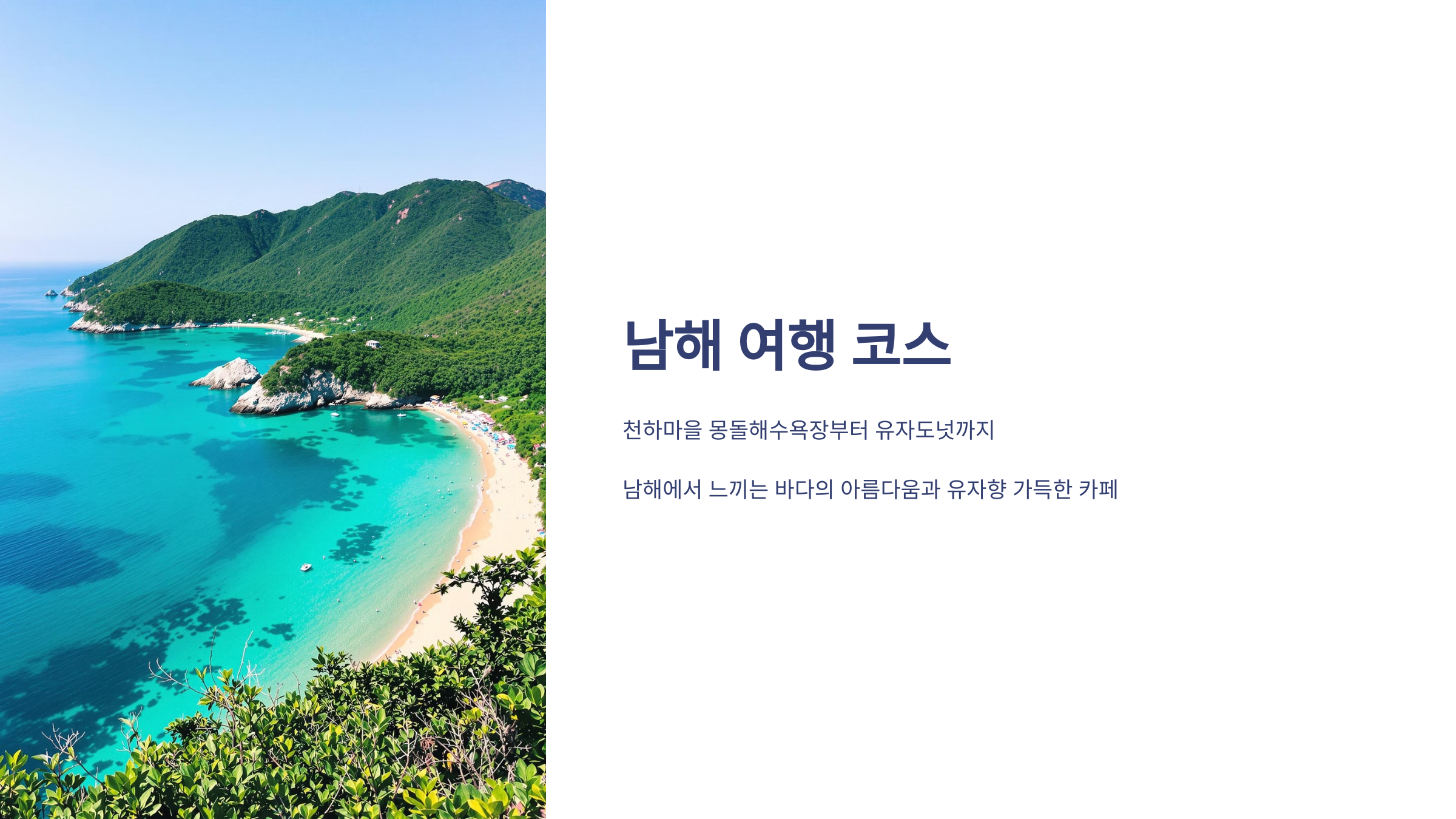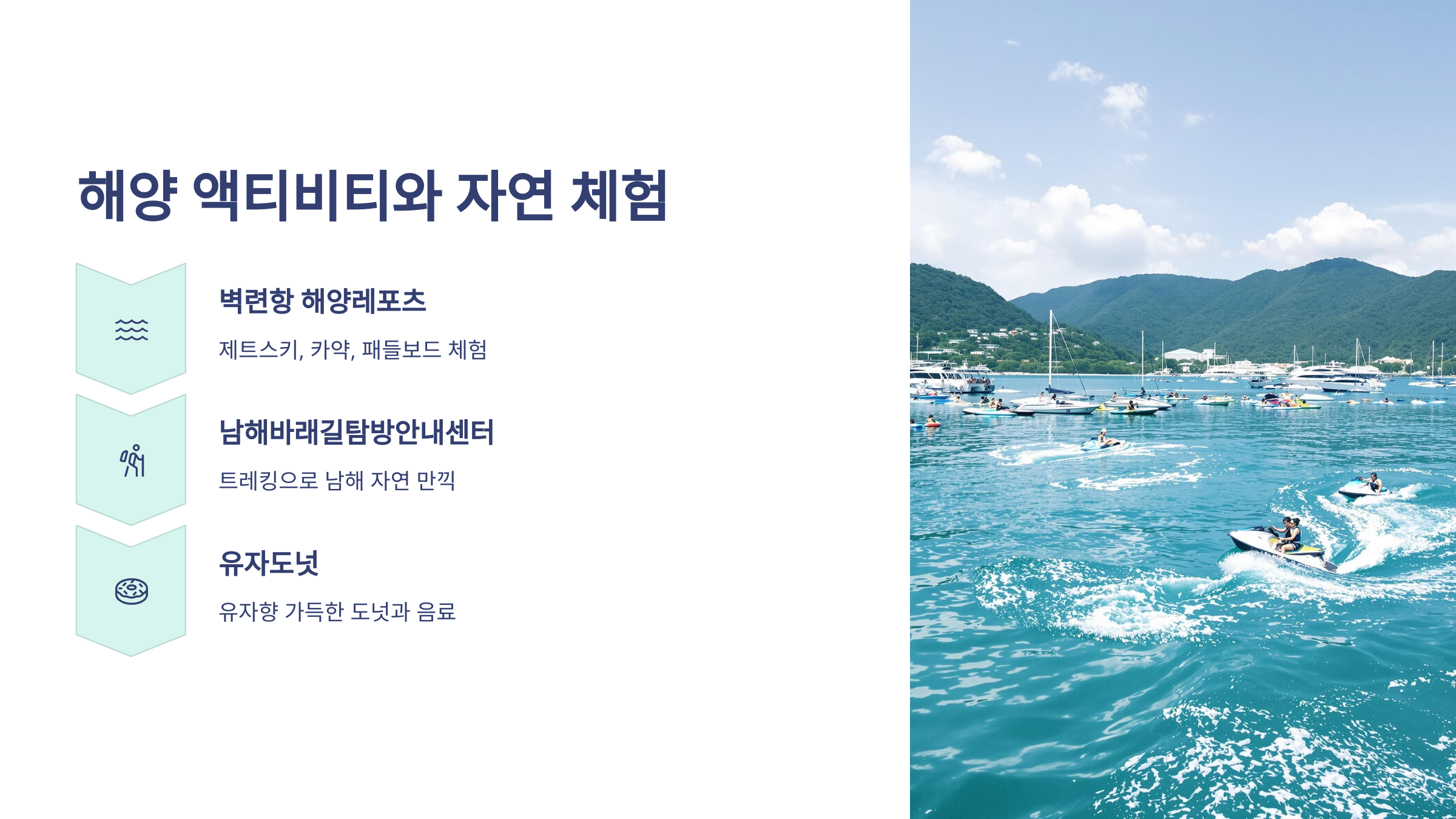 남해의 매력을 느낄 수 있는 이 여행 코스, 여러분도 꼭 한번 경험해 보세요. 천하마을에서 시작해 유자도넛까지 이어지는 이 여행은 자연과 문화를 동시에 만끽할 수 있는 완벽한 여정이 될 거예요. 여러분의 여행에 도움이 되길 바랍니다!