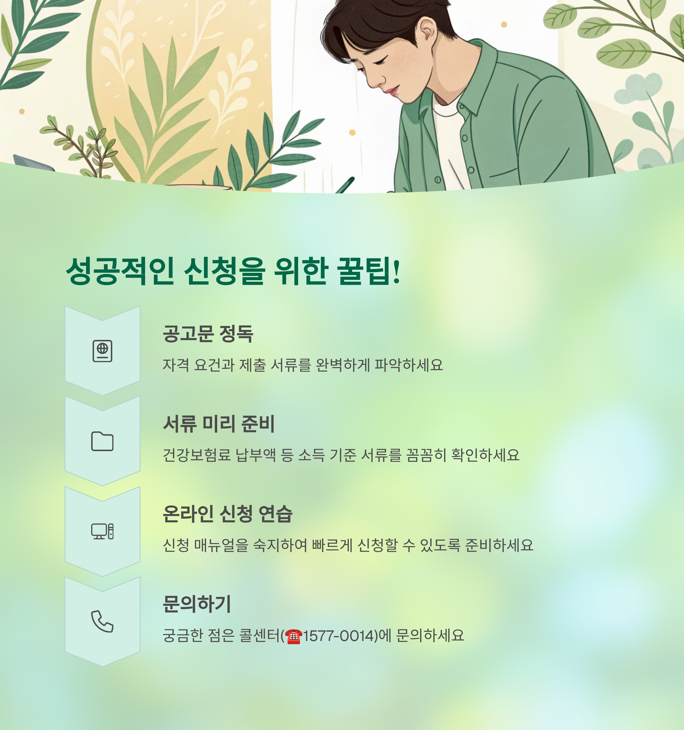 • 서류 준비: 필요한 서류를 미리 발급받고, 오류 없이 정확하게 작성하세요. 특히 건강보험료 납부액 등 소득 기준에 대한 서류는 꼼꼼히 확인해야 합니다.