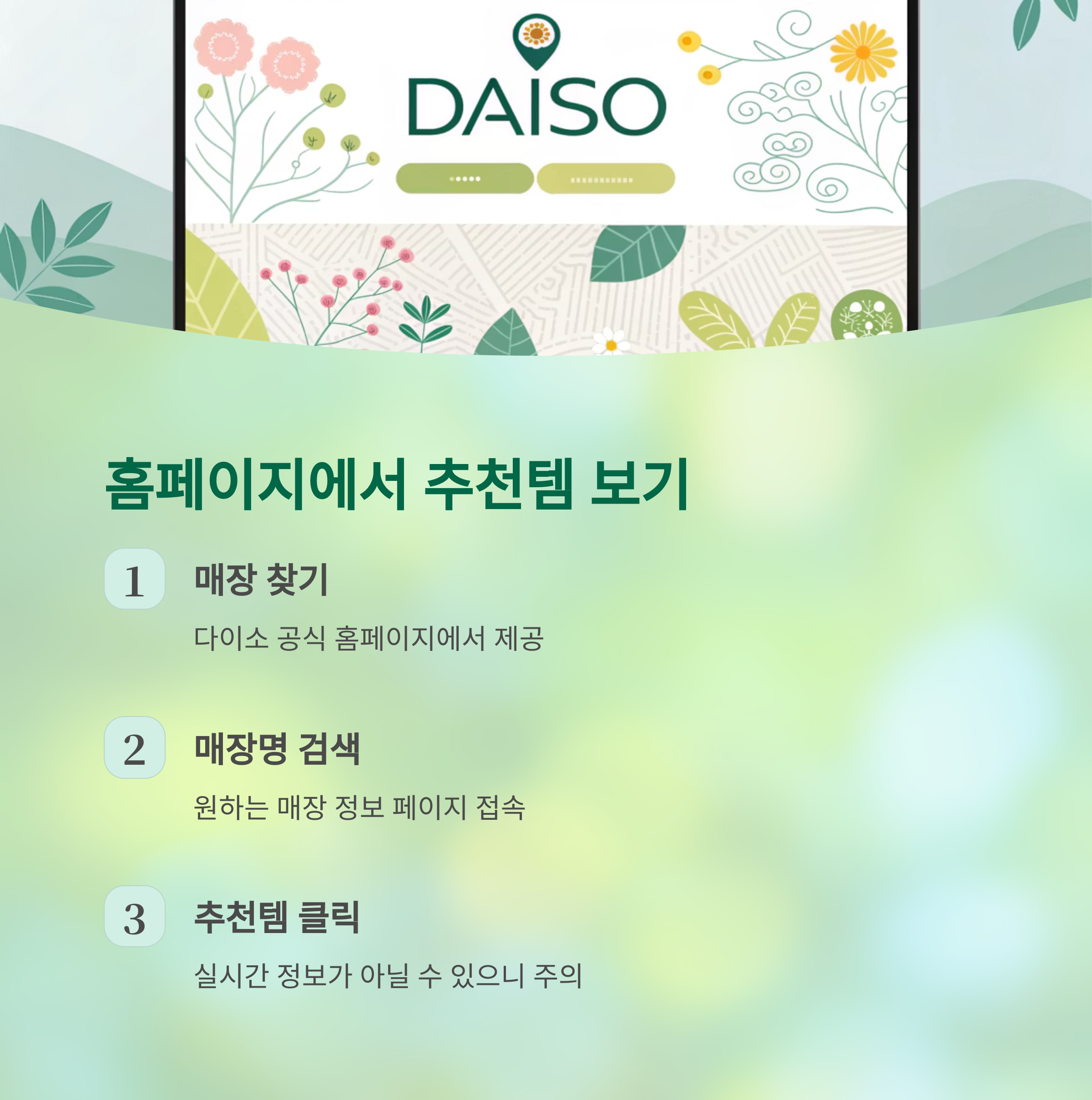 다이소 공식 홈페이지에서도 '매장 찾기' 기능을 이용할 수 있어요. 원하는 매장을 검색한 후, 매장 상세 정보 페이지에서 '추천템' 정보를 확인하세요.