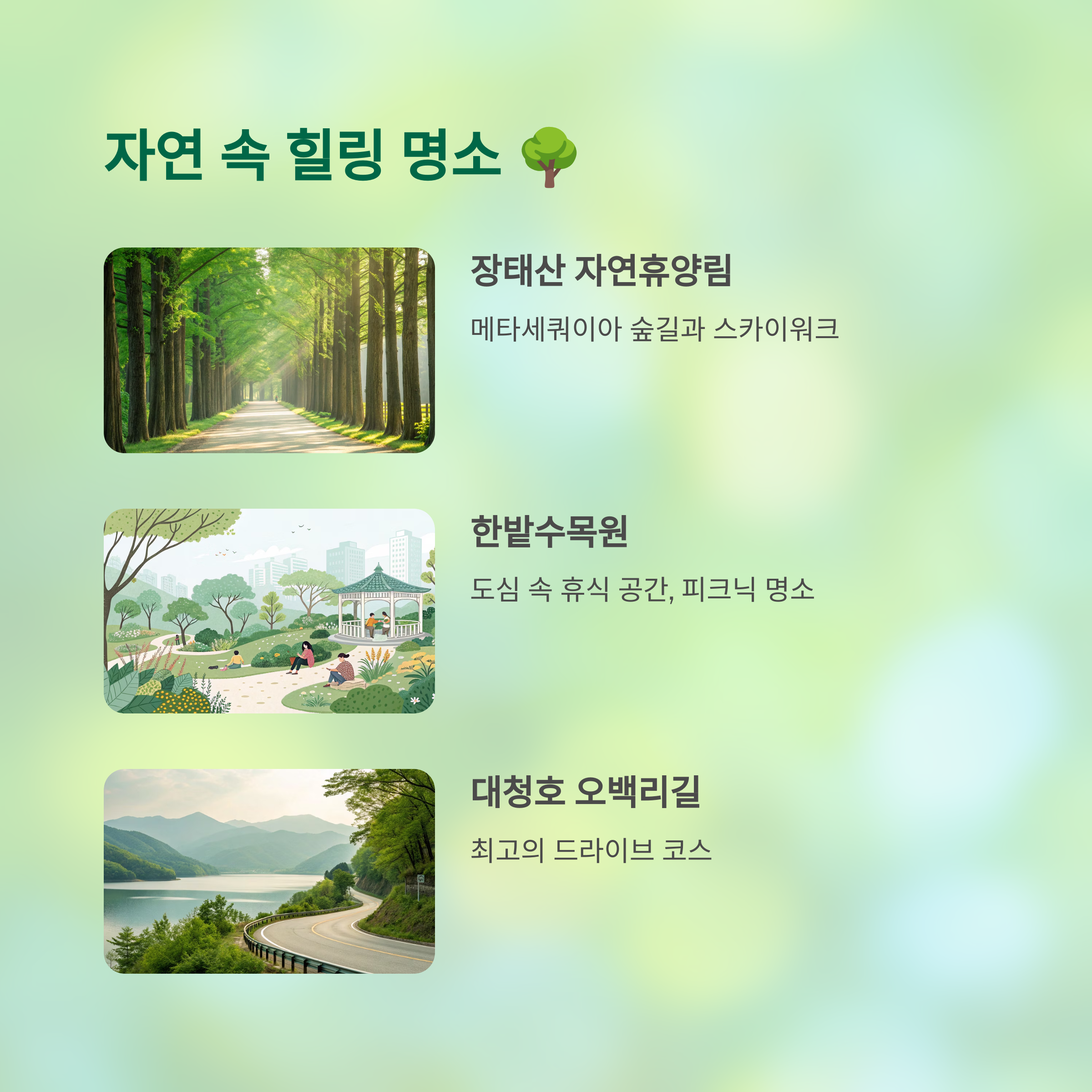 3. 자연 속 힐링: 장태산 자연휴양림, 한밭수목원, 대청호는 바쁜 일상에서 벗어나 여유를 찾기에 최고예요.