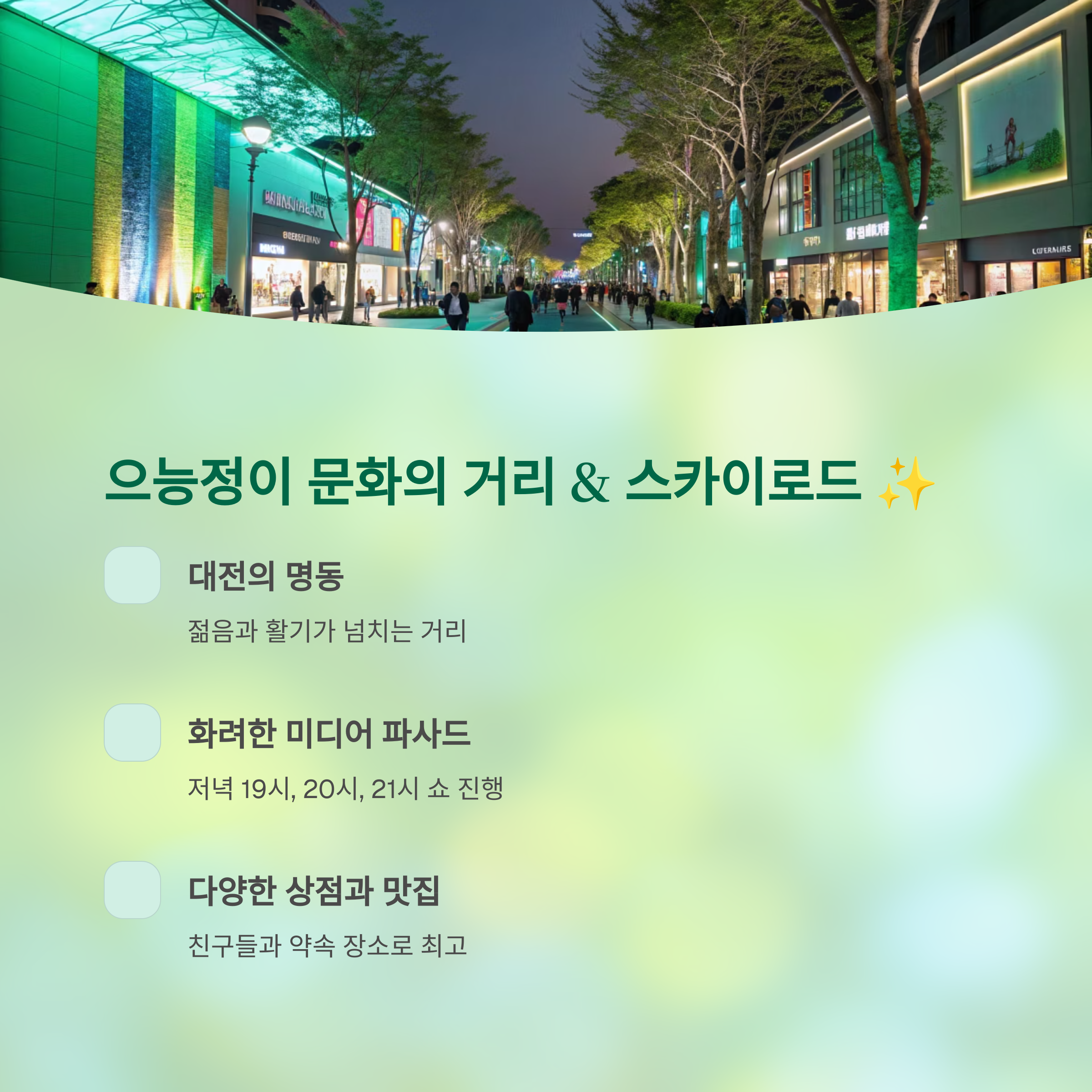 1. 도심의 활기: 으능정이 문화의 거리와 스카이로드는 대전의 젊음을 느낄 수 있는 곳이에요.