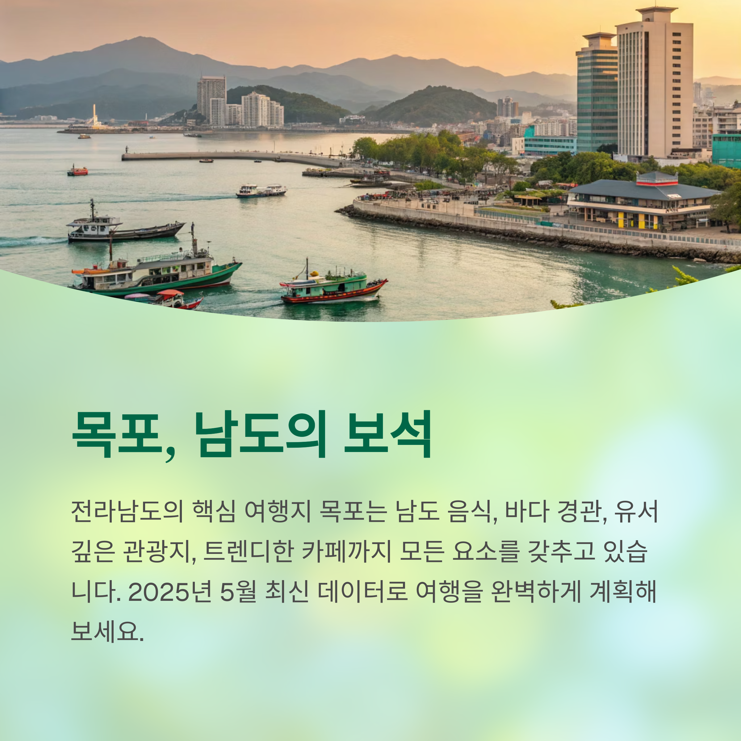 2025년 5월 최신 데이터를 기반으로 호텔, 게스트하우스, 맛집, 카페, 관광지를 정리하여 목포 여행을 완벽하게 계획할 수 있도록 구성했습니다.