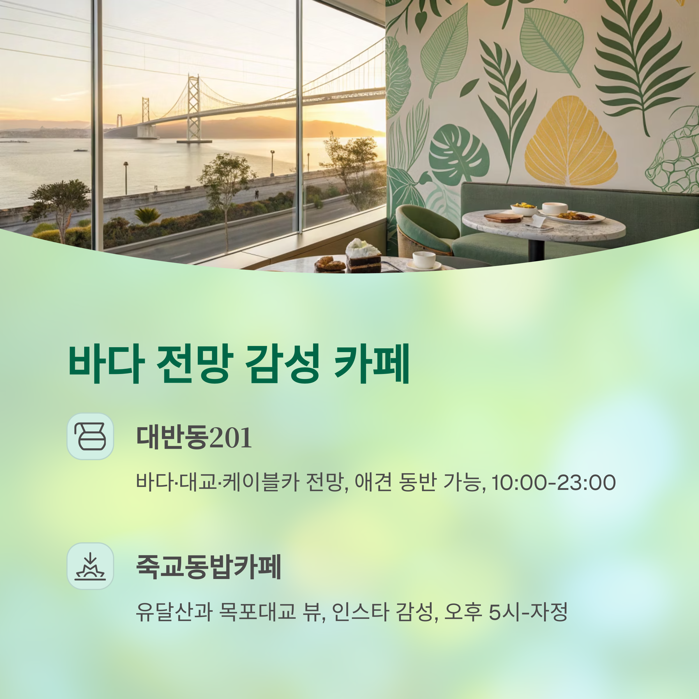 - 카페: 바다뷰·대교 뷰 감성카페가 주류