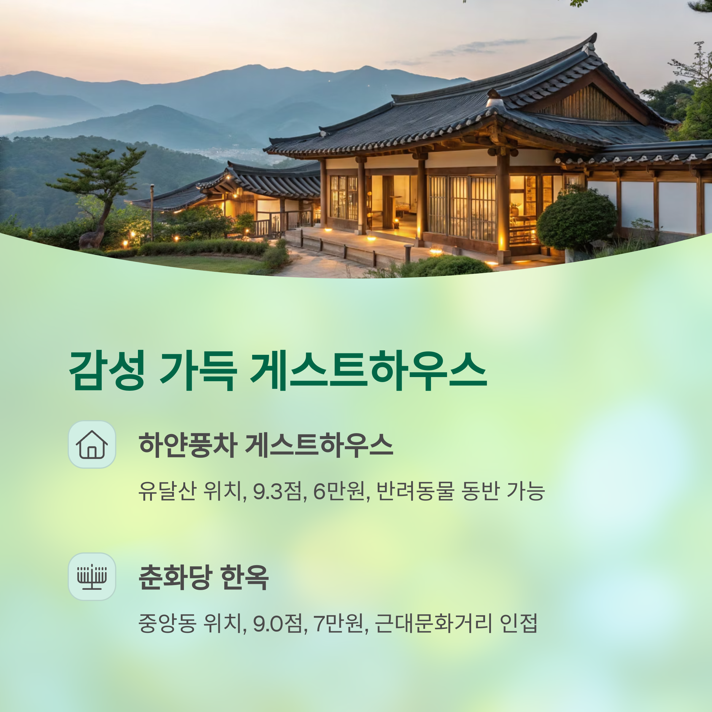 한옥과 게스트하우스는 가격 대비 만족도가 높고 전통적 감성을 선호하는 여행자에게 추천됩니다.