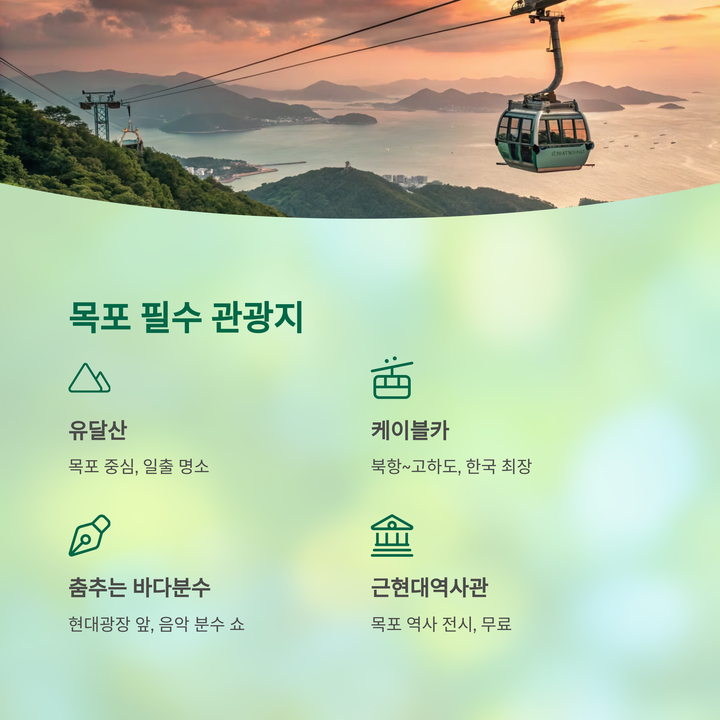 • 관광지: 유달산, 케이블카, 시화마을 등 접근성 좋은 명소 다수