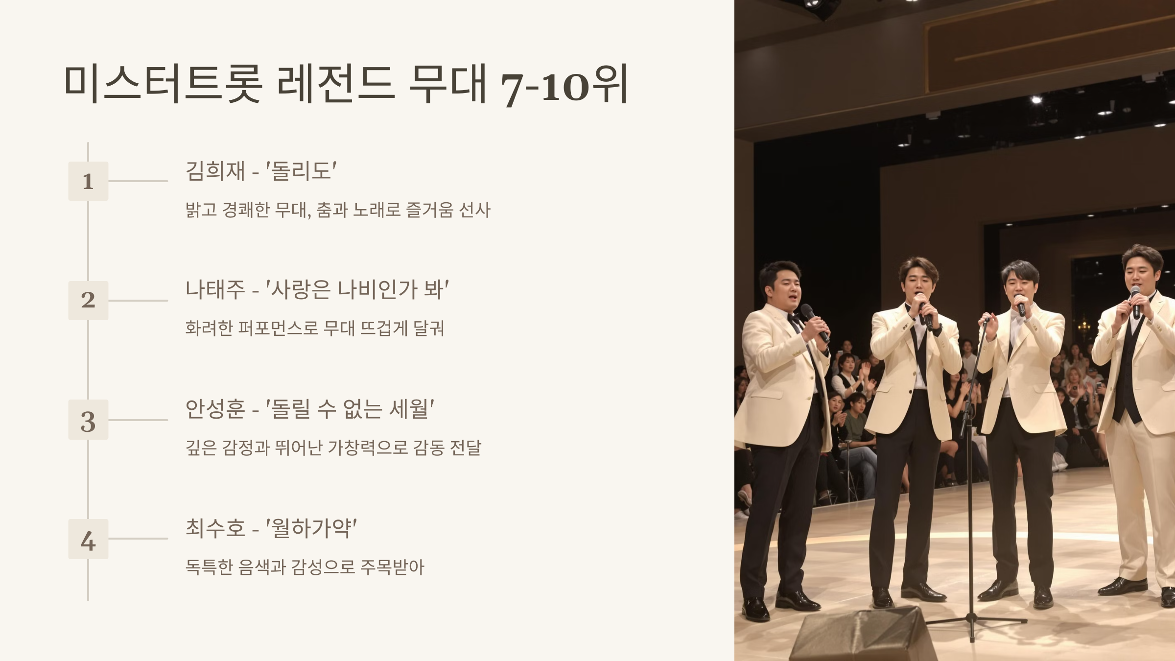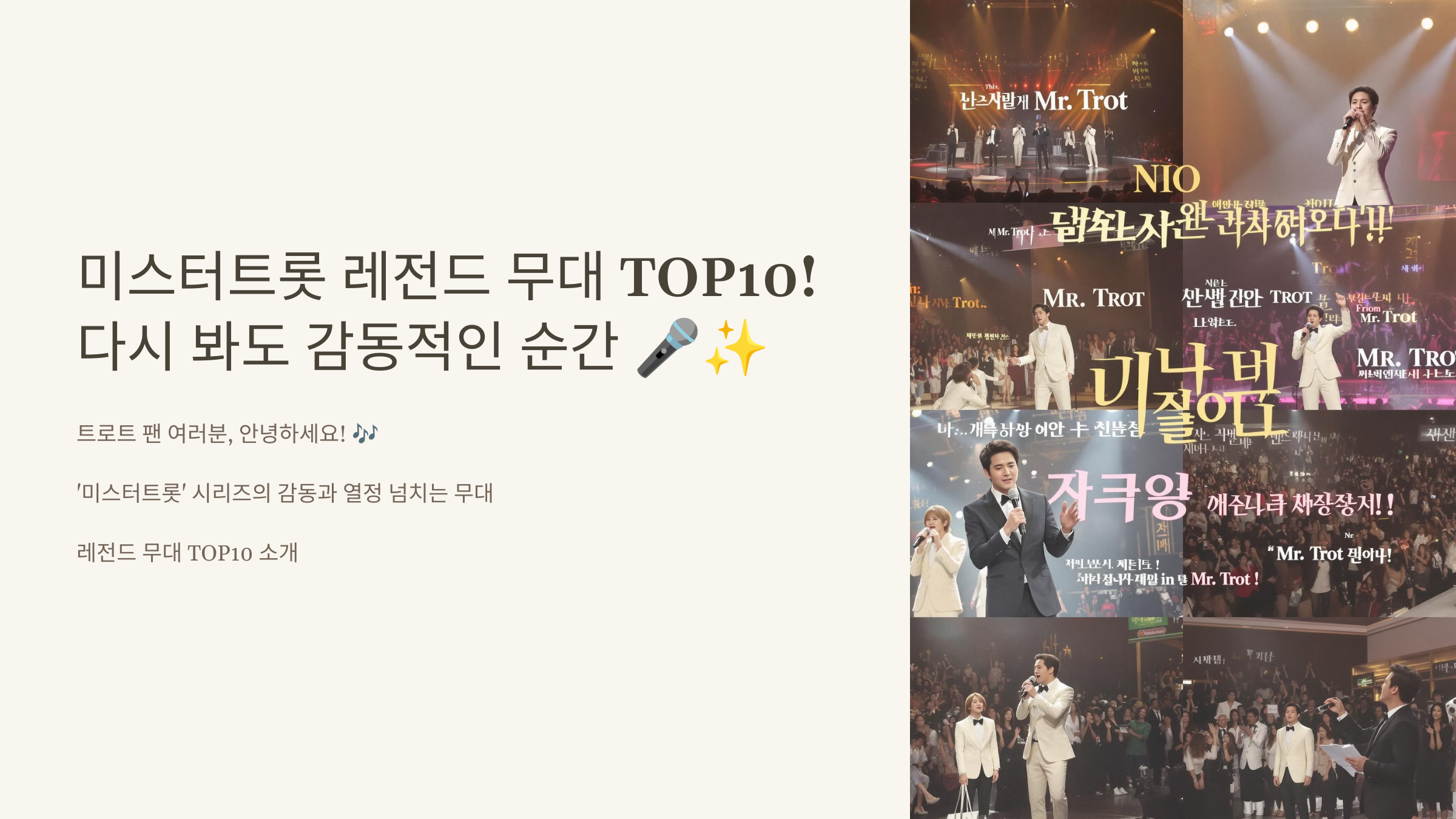 트로트 팬 여러분, 안녕하세요! 🎶 '미스터트롯' 시리즈는 매 시즌마다 감동과 열정이 넘치는 무대로 우리를 사로잡았는데요, 오늘은 그중에서도 다시 봐도 감동적인 레전드 무대 TOP10을 소개해드리겠습니다. 함께 그 순간들을 되새겨볼까요?