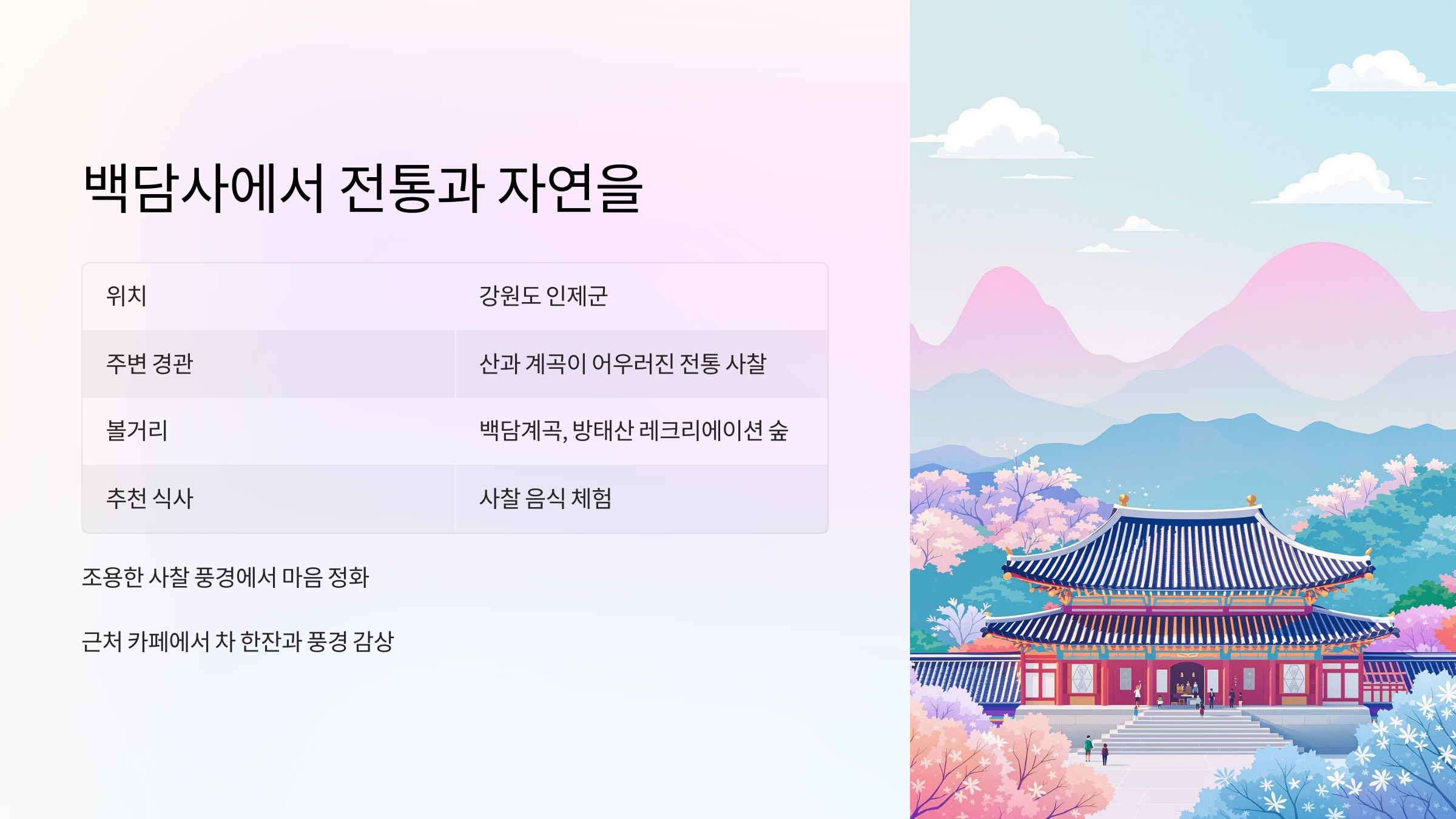조용히 사찰의 풍경을 감상하다 보면 마음이 정화되는 듯한 느낌이 들어요. 사찰 근처 백담사 카페에서 따뜻한 차 한잔과 함께 풍경을 감상하는 것도 강추 코스입니다.