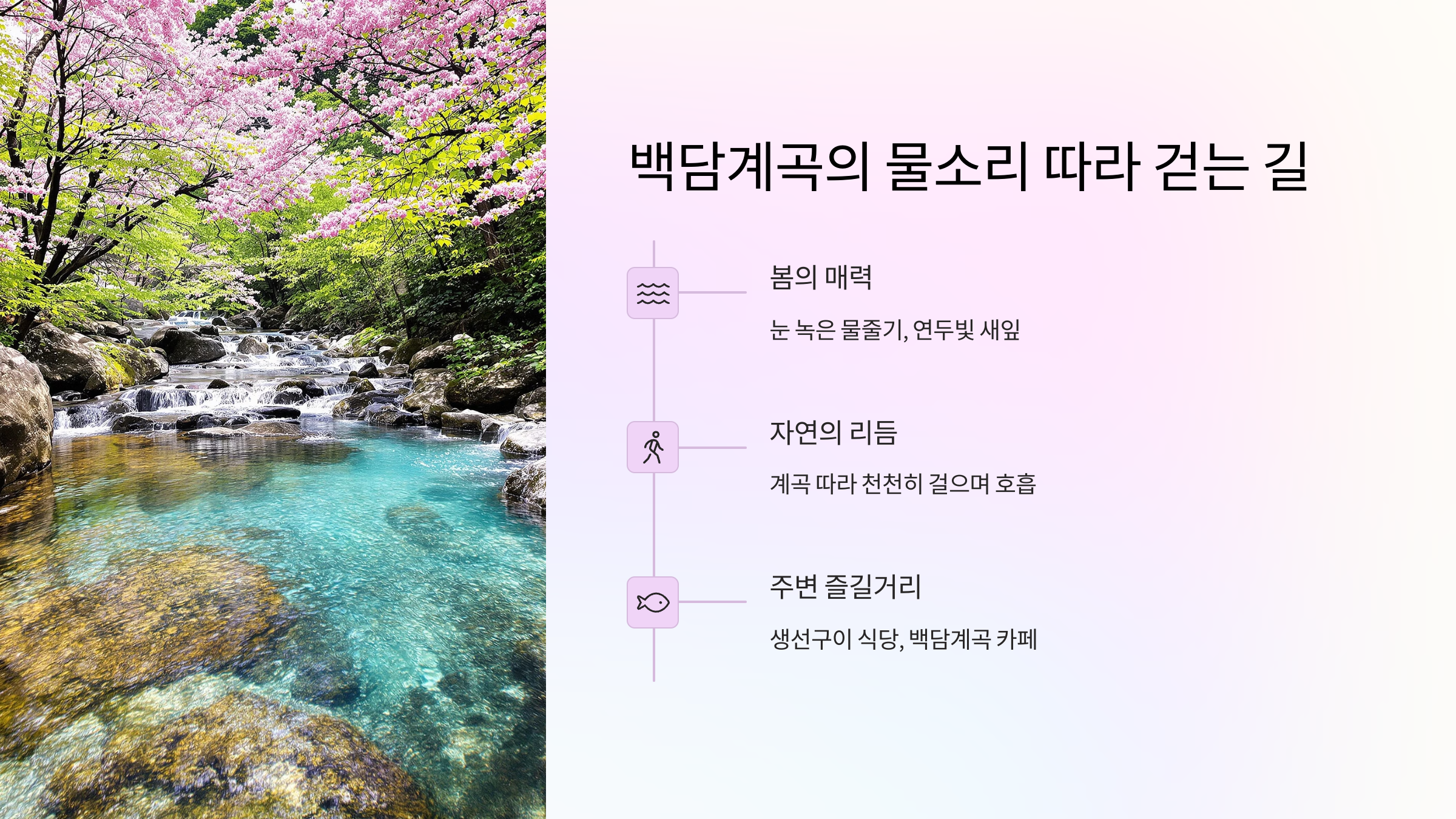 사계절 내내 아름답지만, 특히 봄에는 백담계곡의 매력이 더욱 도드라집니다. 눈이 녹은 물줄기가 시원하게 흐르고, 나무들도 연두빛 새 잎을 틔우는 시기니까요. 계곡 따라 난 길을 천천히 걸으며 자연의 리듬에 맞춰 호흡하면, 마음이 고요해지는 기분이 들어요.