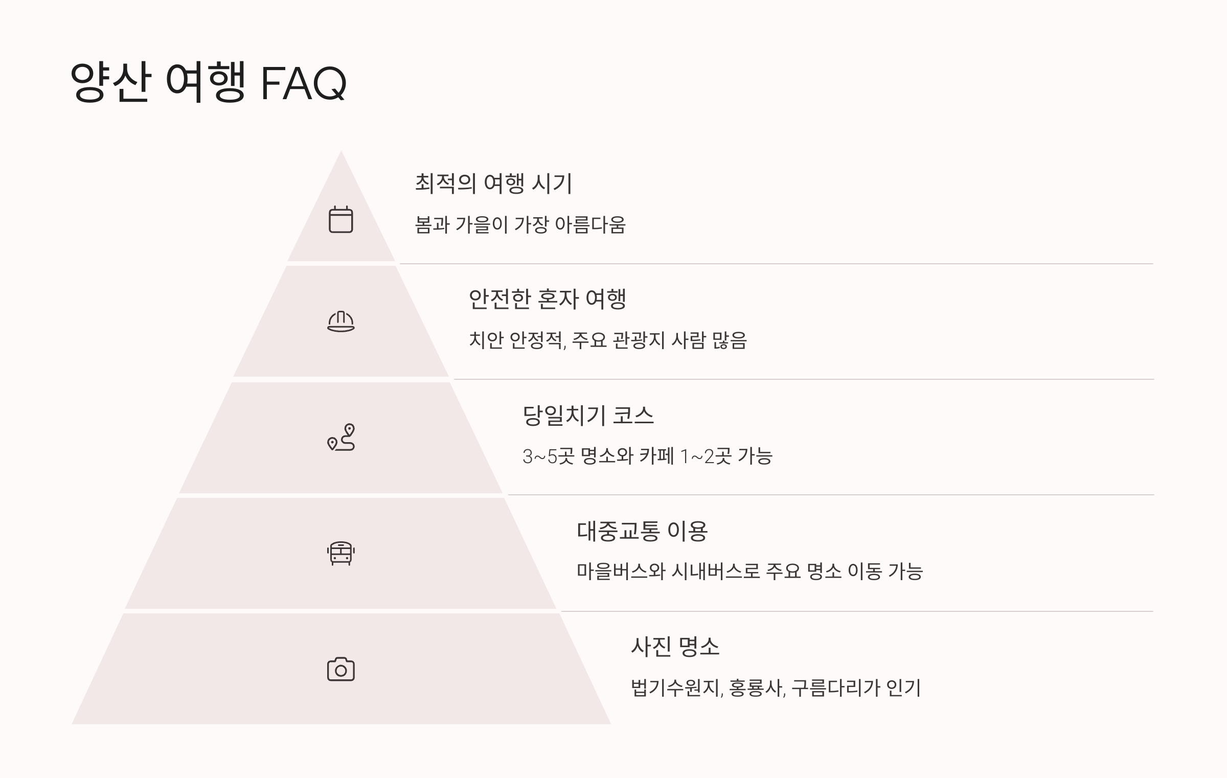 양산은 전반적으로 치안이 안정적인 편이며, 주요 관광지는 사람들이 많아 혼자 여행하기에도 안심할 수 있어요.