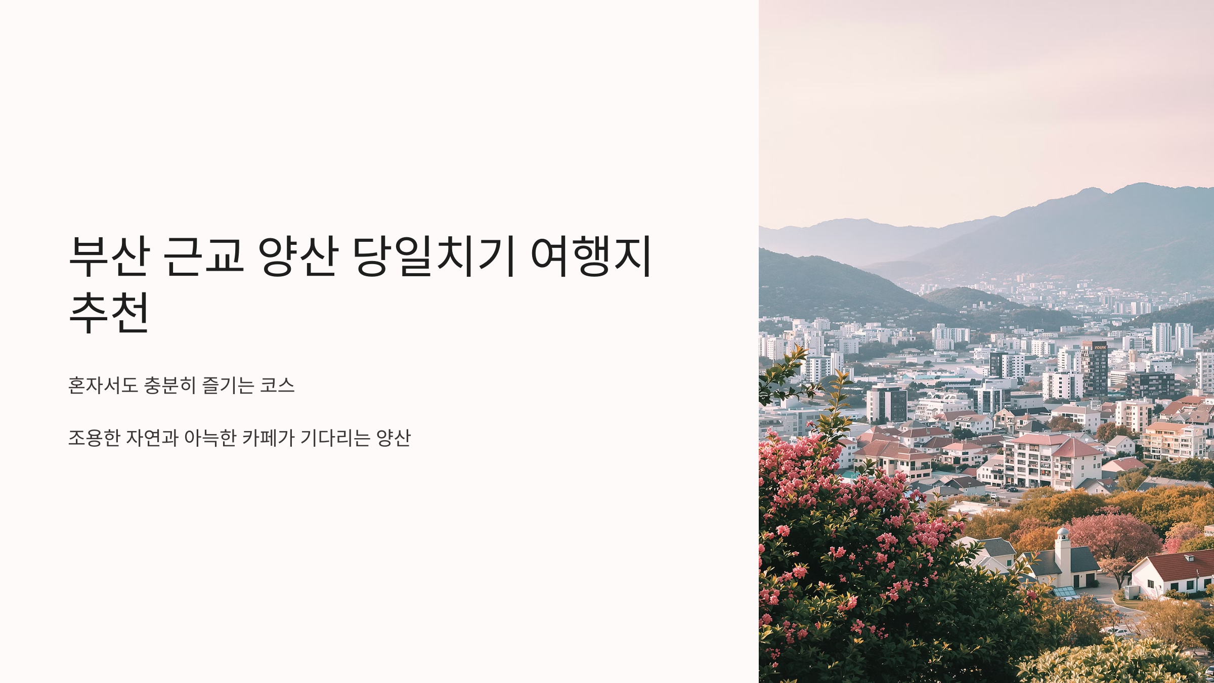 양산은 부산 근교에서 당일치기로 훌쩍 떠나기에 정말 매력적인 곳이에요. 혼자서도 충분히 즐길 수 있는 조용한 명소들과 감성적인 카페들 덕분에, 일상의 피로를 잠시 내려놓고 나만의 시간을 가질 수 있었어요.