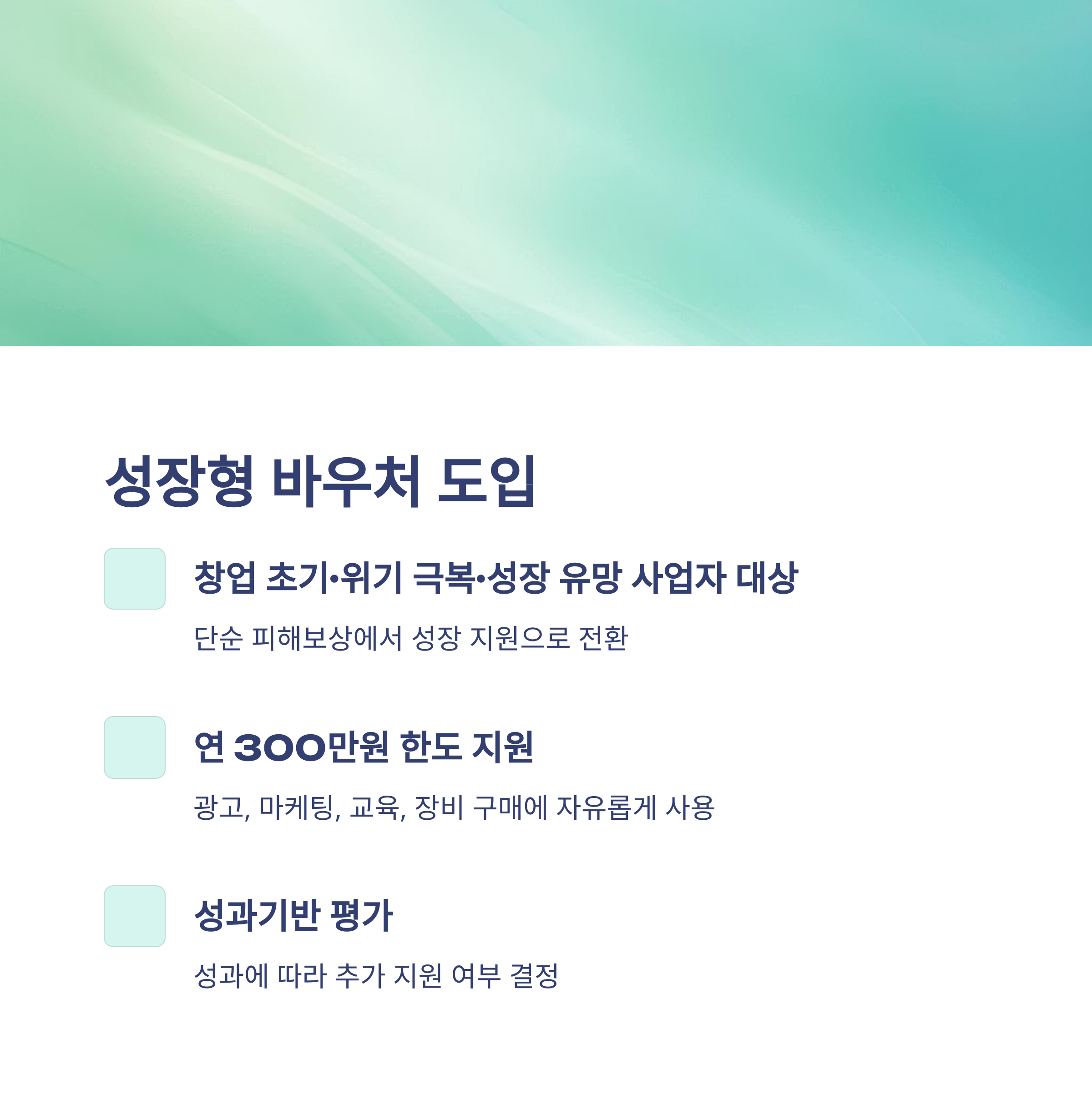 창업 초기·위기 극복·성장 유망 사업자에게 선택적으로 **'성장형 바우처'**를 지급합니다.