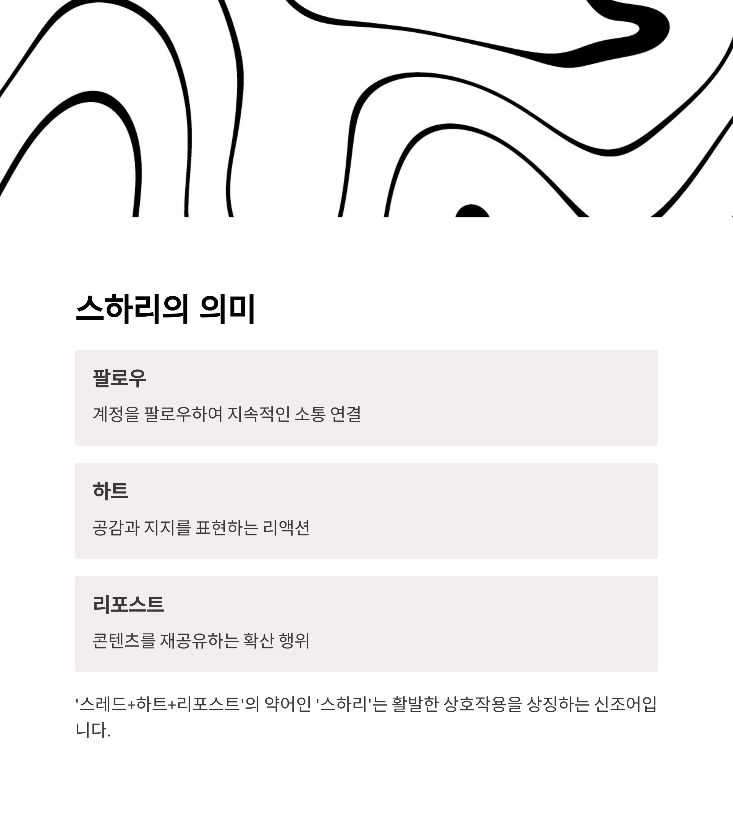 '스하리'는 스레드에서 스레드 팔로우, 하트, 리포스트 세 가지 행동의 줄임말입니다.