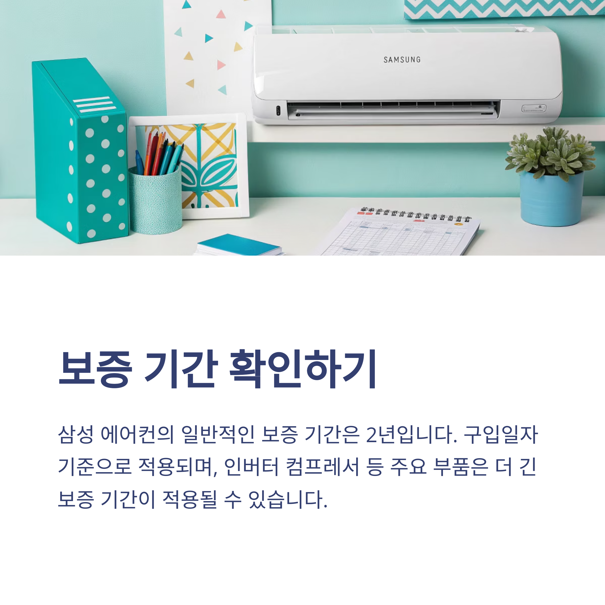 삼성 에어컨의 일반적인 보증 기간은 2년입니다. 단, 제품 구입일자를 기준으로 하며, 보증서가 없거나 유통기간을 고려하여 생산 연월에 3개월을 감안하여 적용될 수 있습니다. 인버터 컴프레서 등 주요 부품은 더 긴 보증 기간이 적용될 수 있으니, 삼성전자서비스 홈페이지에서 제품 보증 기간을 반드시 확인하세요.