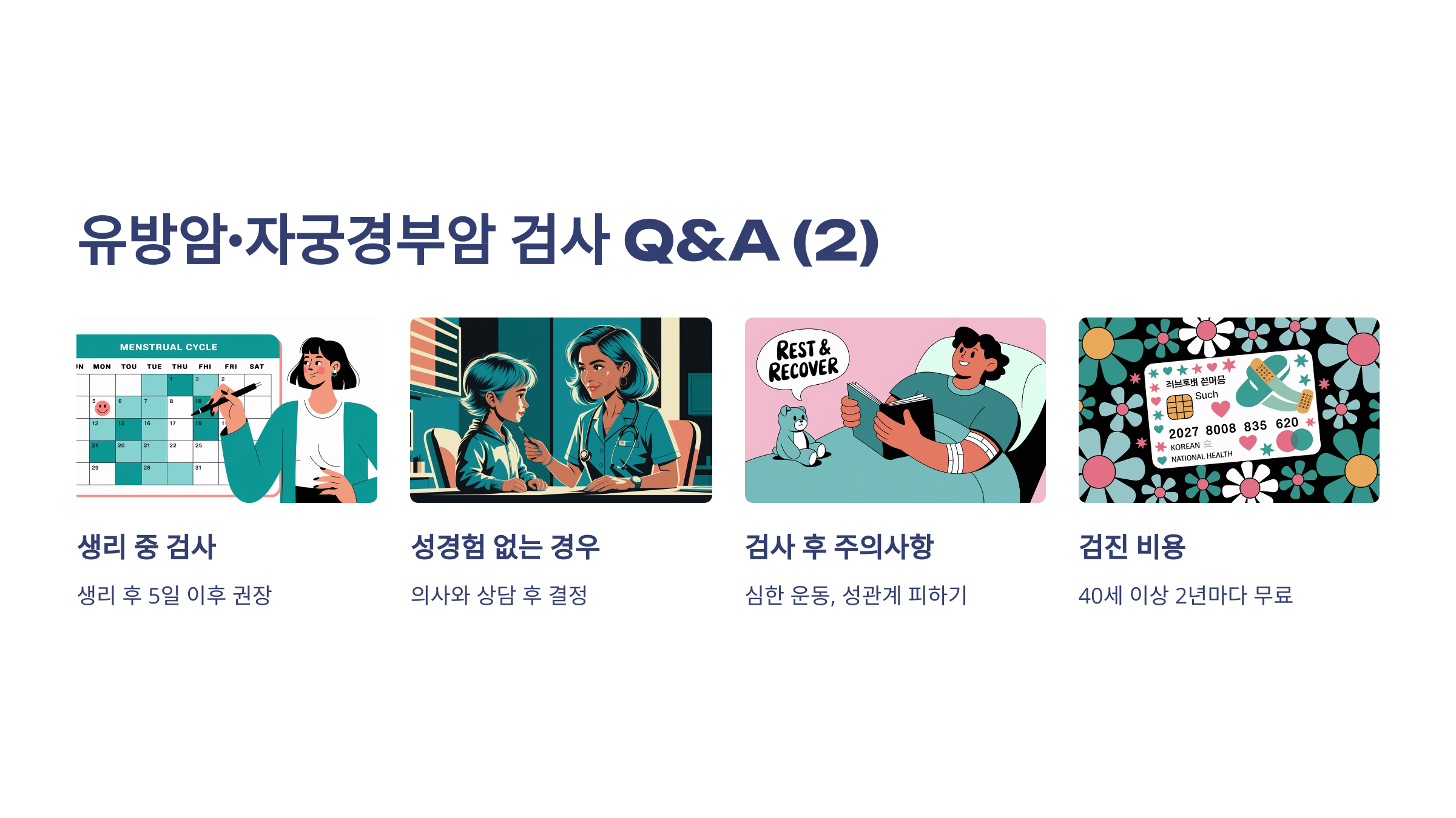 ✅ 자궁경부암 검사 후 – 일부 출혈이 있을 수 있으므로, 당일은 심한 운동이나 성관계를 피하는 것이 좋아요.