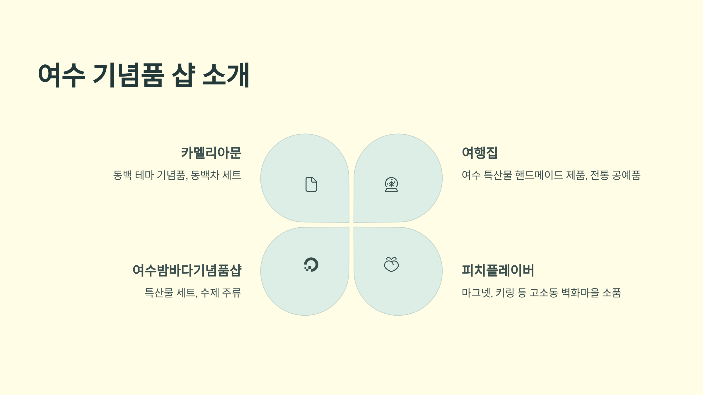 | 동백 꽃 모양 기념품 | 동백을 테마로 한 다양한 소품, 화려하고 고유한 디자인 | 10,000원 ~ 50,000원 |
