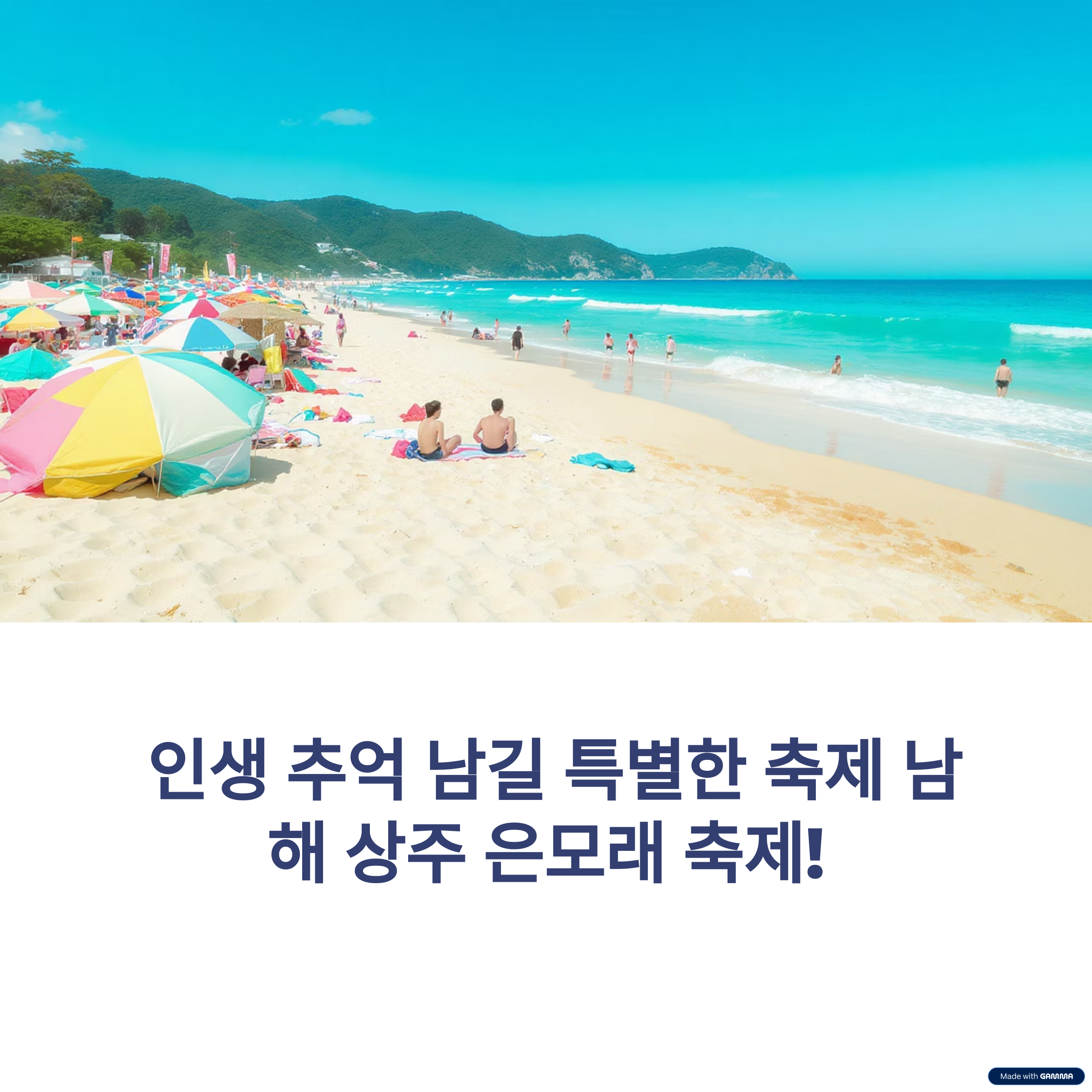 남해 상주 은모래 축제는 단순한 지역 축제가 아닙니다. 아름다운 자연 속에서 소중한 사람들과 함께 웃고, 즐기고, 교감하며 새로운 추억을 쌓는 특별한 기회입니다. 북적이는 유명 관광지를 벗어나, 진정한 쉼과 즐거움이 있는 곳을 찾고 있다면 더 이상 망설이지 마세요.