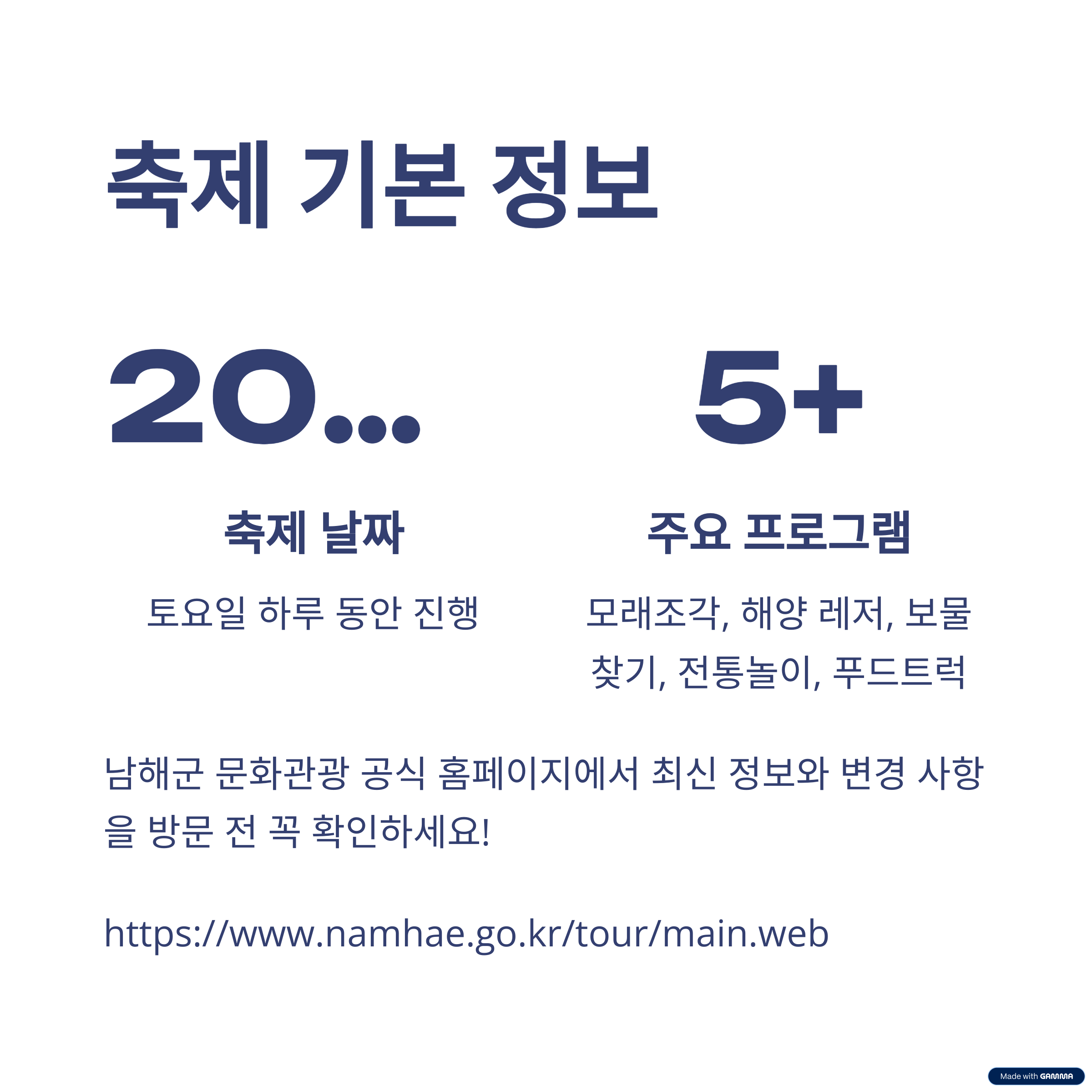 https://www.namhae.go.kr/tour/main.web 축제 관련 최신 정보나 변경 사항을 방문 전 꼭 확인해 보세요!
