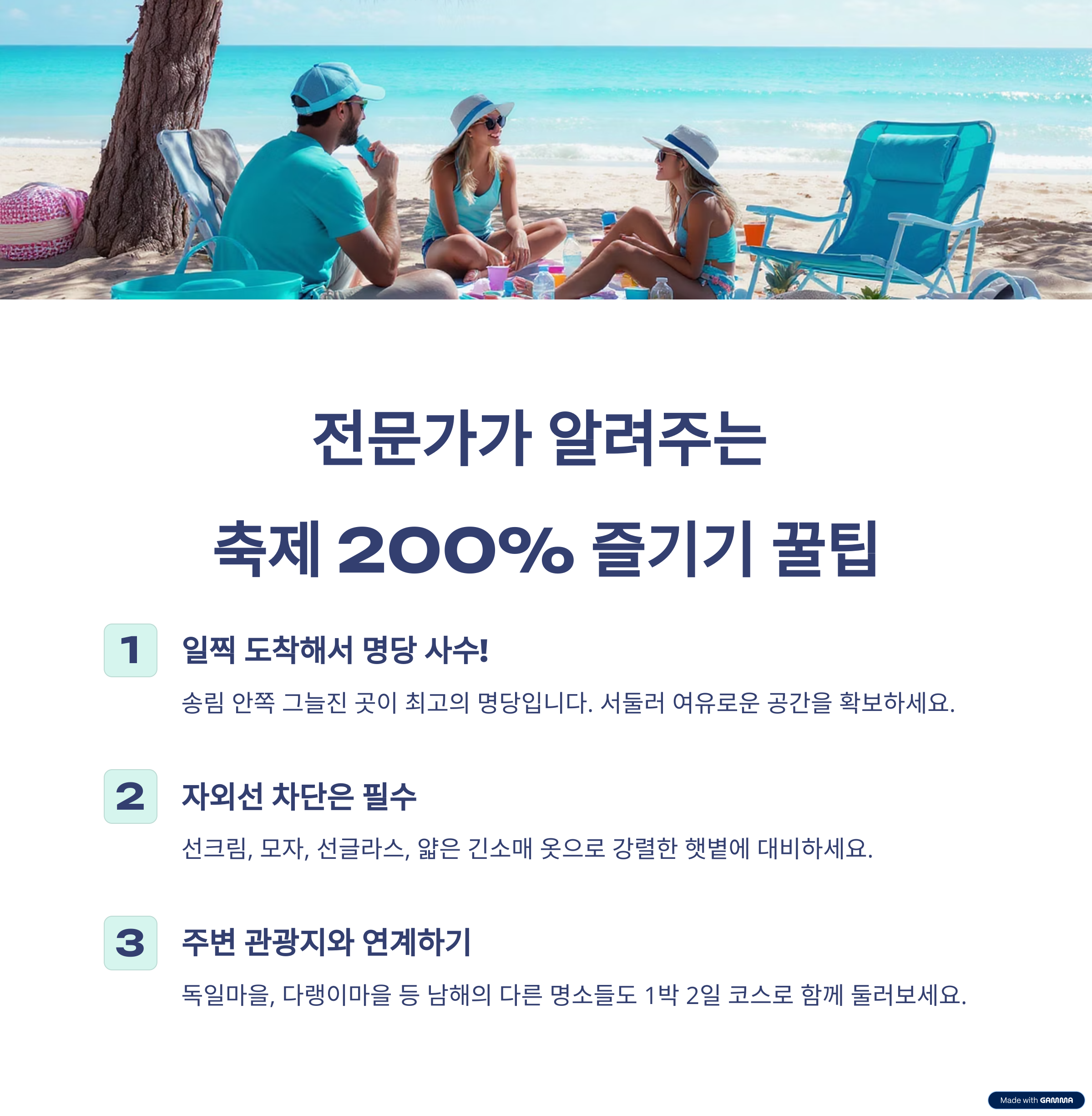 남해 상주 은모래 축제는 단순한 지역 축제가 아닙니다. 아름다운 자연 속에서 소중한 사람들과 함께 웃고, 즐기고, 교감하며 새로운 추억을 쌓는 특별한 기회입니다. 북적이는 유명 관광지를 벗어나, 진정한 쉼과 즐거움이 있는 곳을 찾고 있다면 더 이상 망설이지 마세요.