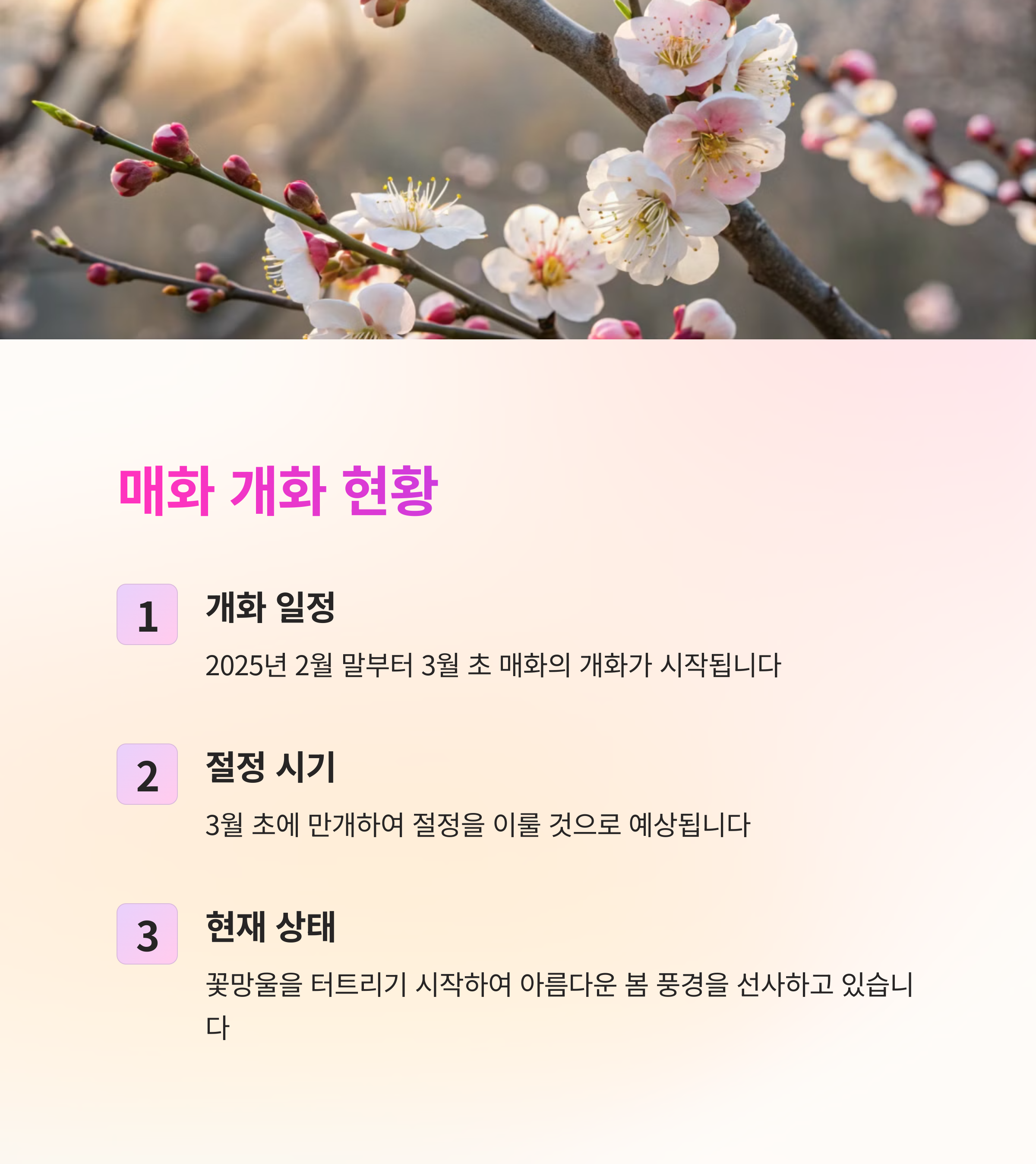 | 매화 개화 시기 | 2025년 2월 말~3월 초 개화 시작, 3월 초 절정 |