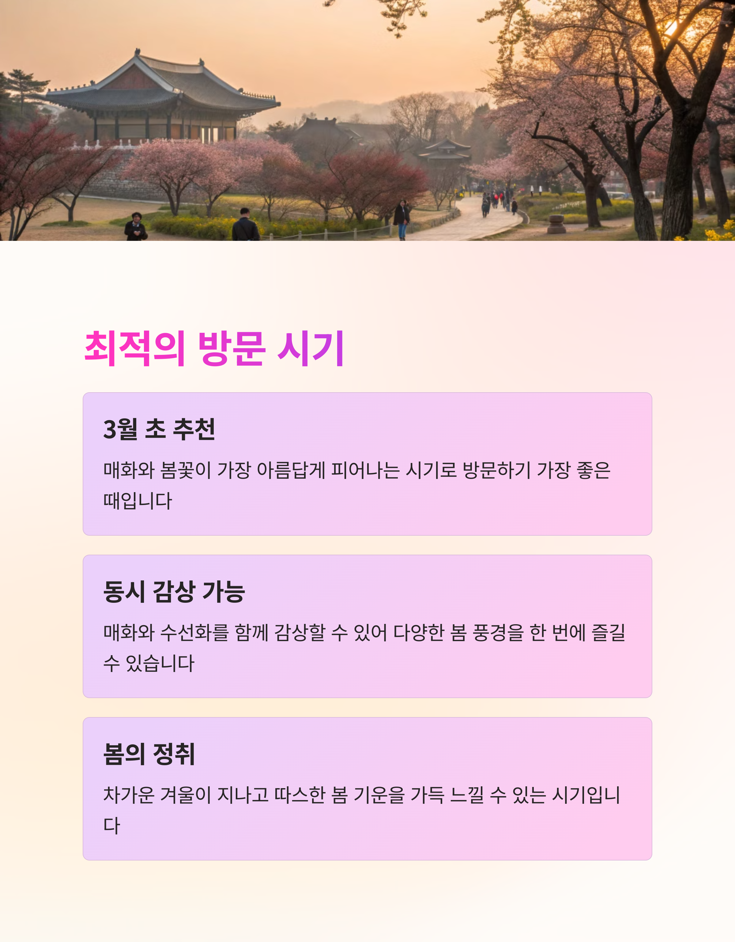 | 매화 개화 시기 | 수선화 개화 시기 | 추천 방문 시기 |
