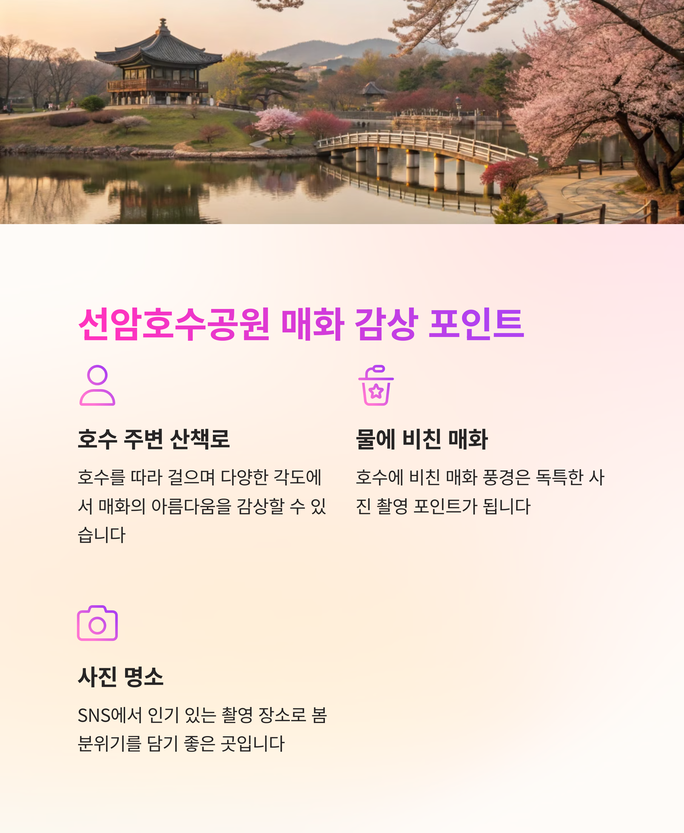 안녕하세요! 따뜻한 봄을 맞이하여 울산 선암호수공원의 매화와 수선화 개화 소식을 전해드립니다. 봄이 찾아오면서 공원 곳곳이 꽃으로 물들고 있으며, 이번 시즌에는 특히 매화와 수선화가 아름다운 모습을 뽐내고 있습니다. 매화는 2025년 2월 말부터 3월 초까지 개화가 시작되며, 3월 초 절정을 맞이할 것으로 예상됩니다. 선암호수공원의 매화는 꽃망울을 터트리며 따뜻한 봄날의 정취를 한층 더해주고 있습니다. 수선화 역시 봄을 대표하는 꽃으로, 선암호수공원에서는 다양한 꽃들과 함께 피어나며 사계절 내내 자연의 아름다움을 선사하고 있습니다. 특히 봄에는 매화와 함께 어우러져 더욱 화사한 경관을 연출합니다. 3월 초에 방문하시면 매화뿐만 아니라 다양한 봄꽃들도 함께 감상할 수 있어 완벽한 봄 나들이가 될 것입니다. 😊